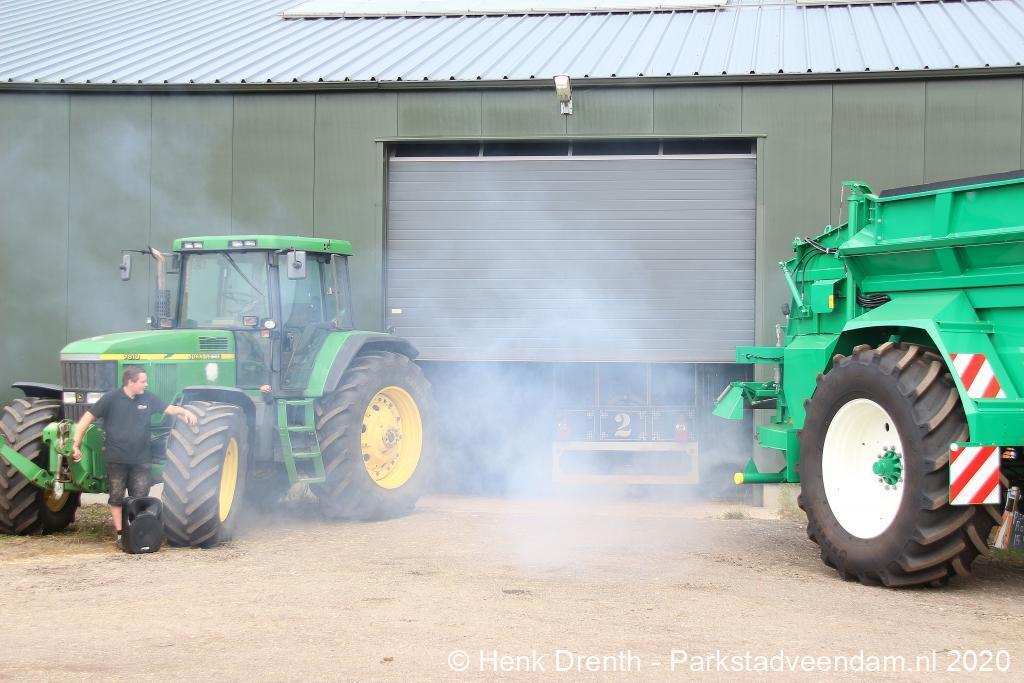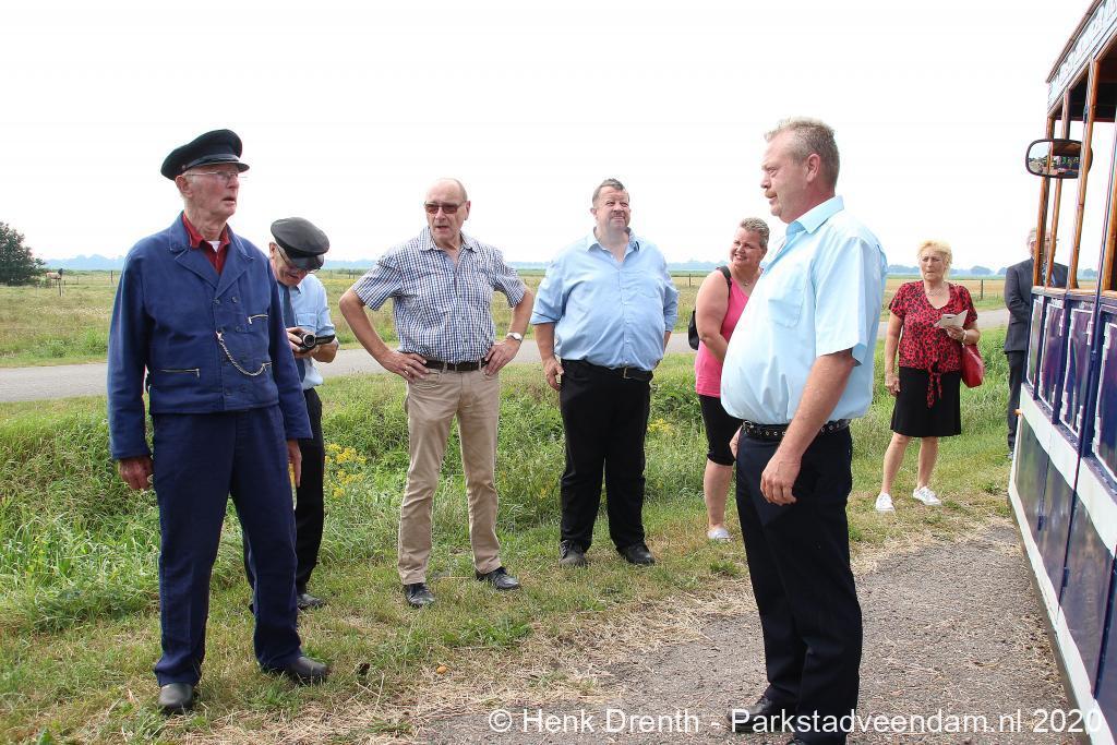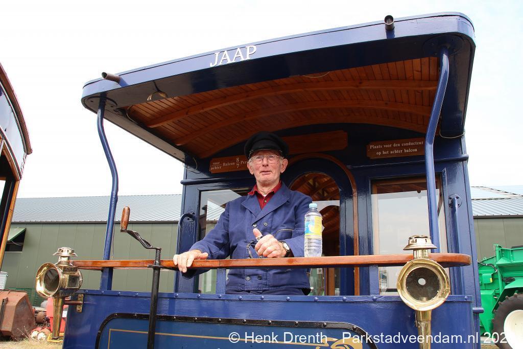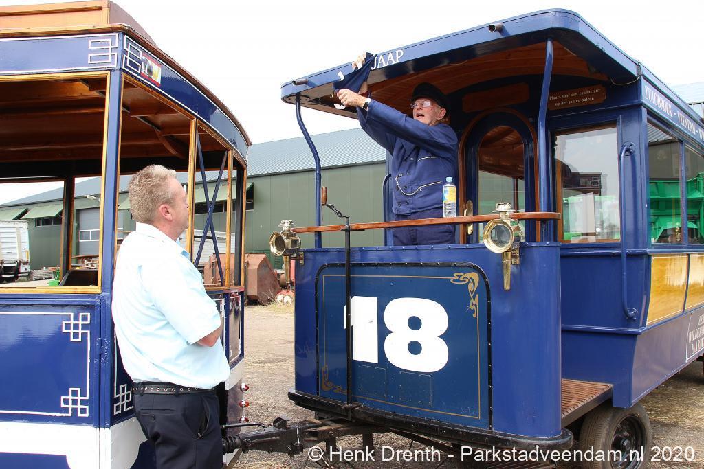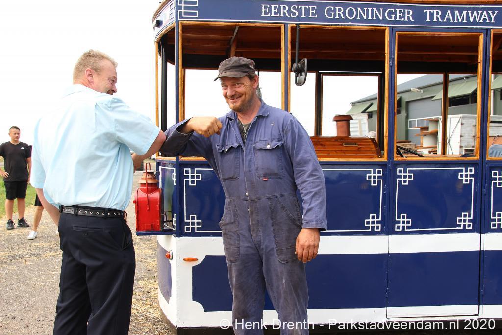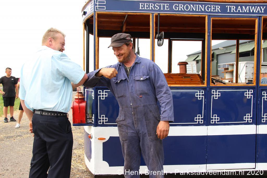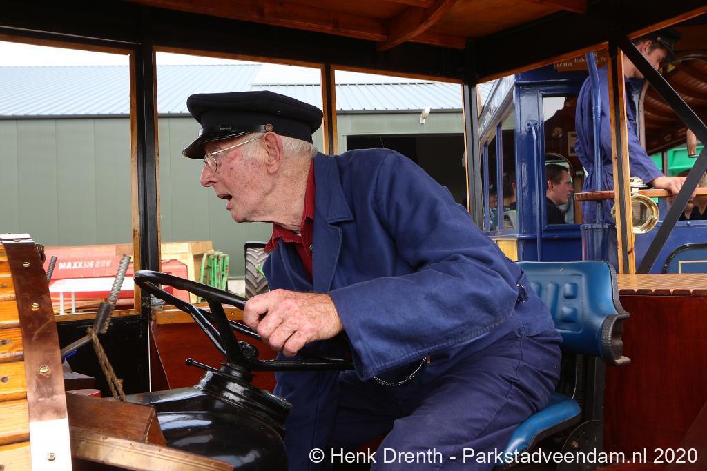 Met aan weerszijden van de grote deur door twee imposante landbouwmachines geflankeerd reed Jan Stevens de loc, met daarachter de paardentram, langzaam naar buiten. Hij zette de loc in een schuine bocht voor Jaap de Weijs. Er was eerst nog een rol voor machinist Peter Puister. Aan hem overhandigde Stevens de sleutel van de gereviseerde stoomloc.