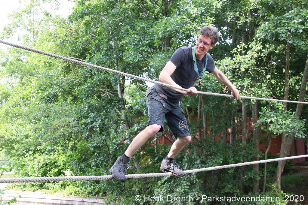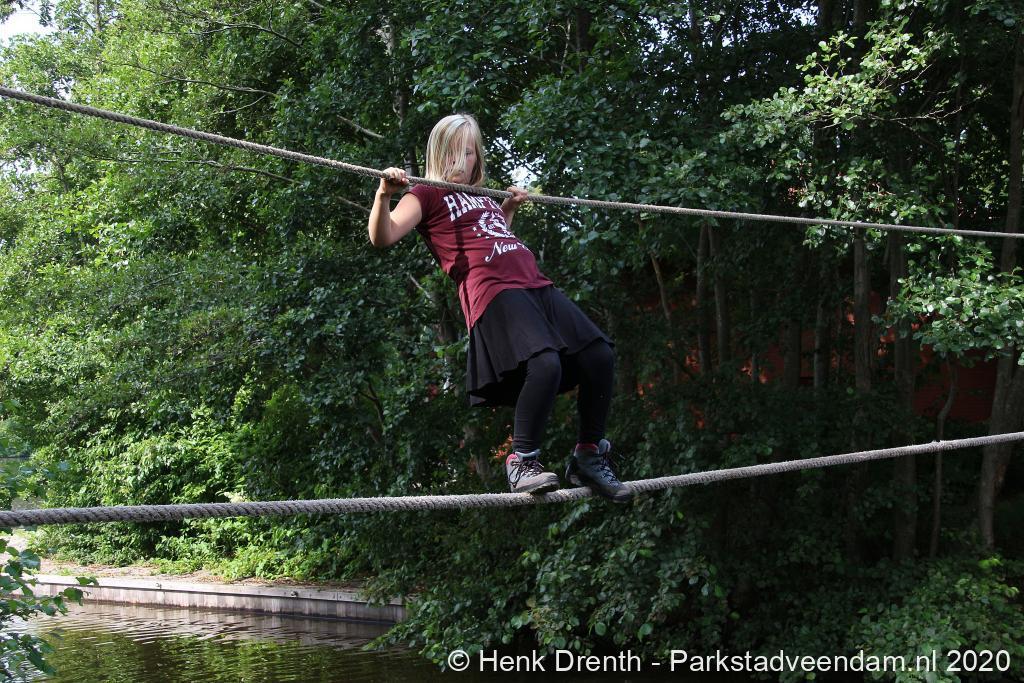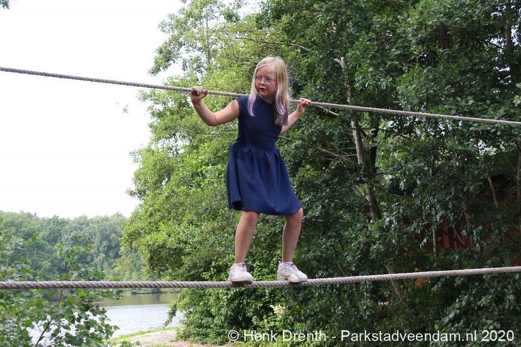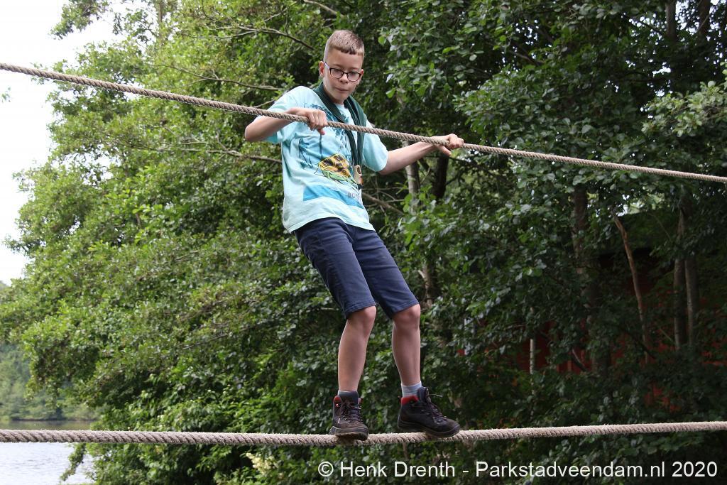 Groepjes volwassenen vonden ook uitdagingen op hun pad. Dat gelijk al goed begon met een ‘apenbrug’, twee boven elkaar gespannen wiegelende touwen over het water naar de overkant. Sommige volwassenen waagden zich er niet aan. Amber (11) uit Veendam zit bij Clias op turnen. Dat hielp zeker mee. Lukas (11) zit zelf op scouting en pakte het technisch aan. In een stukje bos was ook een klimparcours met touwen.