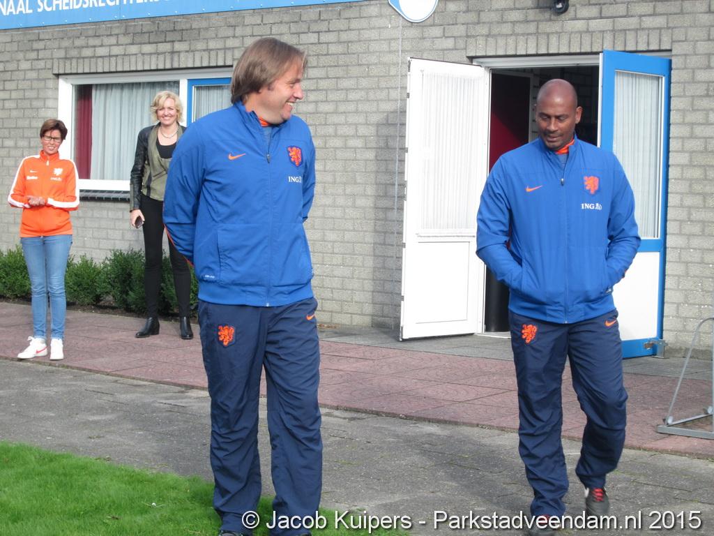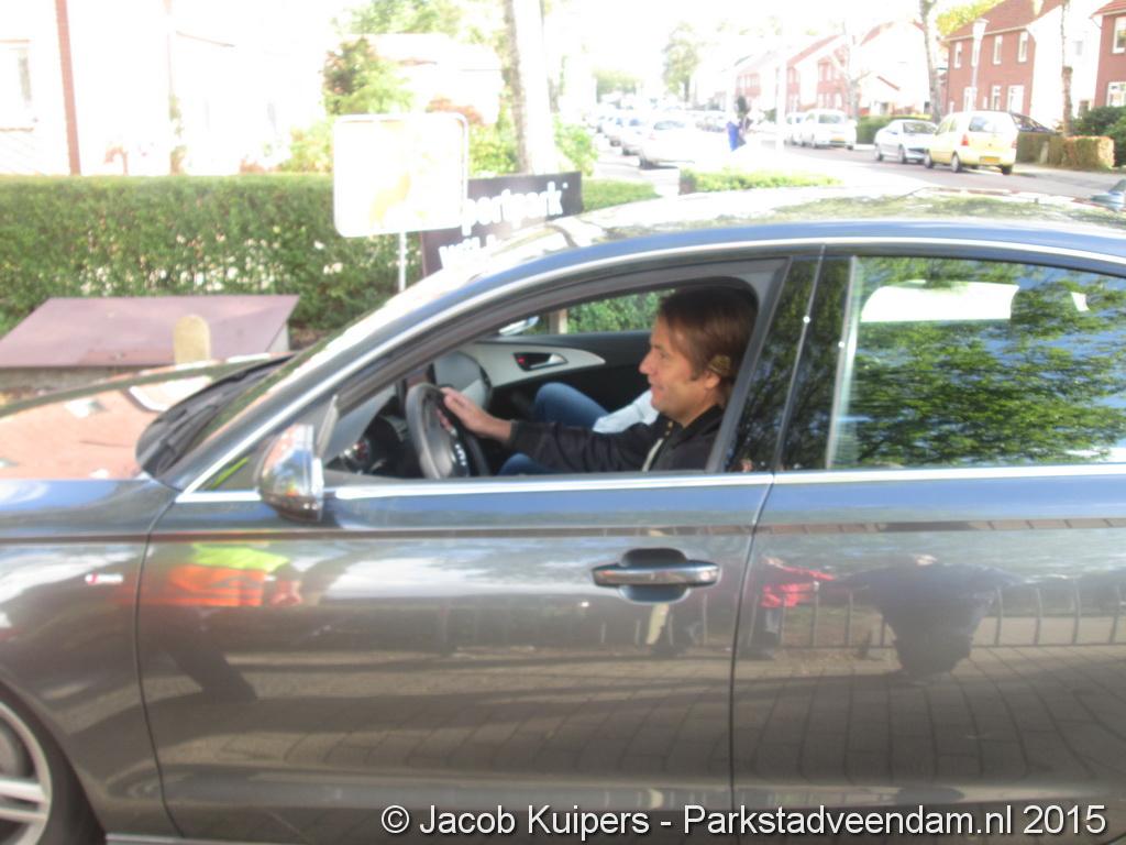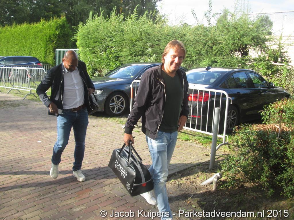 Maar het beroemde tweetal was in geen 'velden of wegen' te zien. De dienstdoende parkeerwachters verkeerden een beetje in Sinterklaas stemming en zeiden: “zouden ze wel of niet komen. Ja, ze konden hun auto ook kwijt bij de sporthal”, was de algemene reactie. “Maar dan had er wel iemand gebeld naar ons”, zei één van de parkeerwachters. Maar ineens was de opluchting groot. Daar kwamen de internationals aan rijden en Jaap Veldhuis was er als eerste bij. Op de voet gevolgd door de 'pennenridder' en ploatjesmoaker van Wildervank.