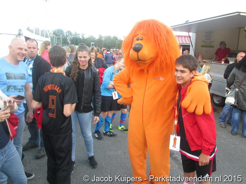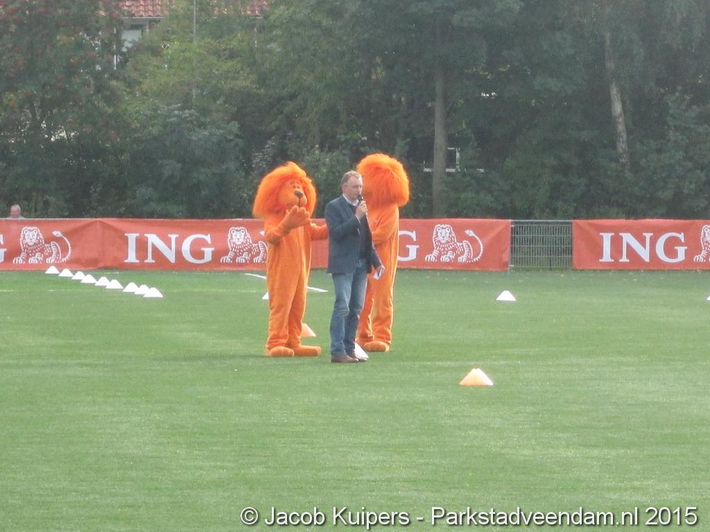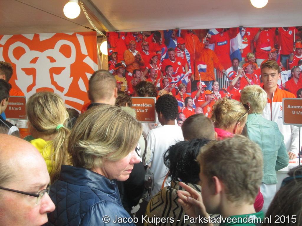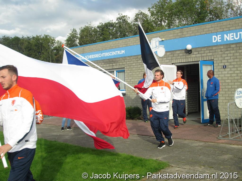 Maar ook de frietjes gingen vlot door de keeltjes gevolgd door de hamburgers, waar Erwin de Vries en Erik Romp verantwoordelijk voor waren. Daarna ging ik naar het kunstgrasveld en het publiek was inmiddels volgestroomd. Inmiddels stond het oranje-tweetal te trappelen van ongeduld. Daarna gingen de vaandeldragers het veld op. Op de voet gevolgd door Witsche en Winter. Inmiddels waren ook de Nederlandse Leeuwen gearriveerd op de middenstip van het speelveld.