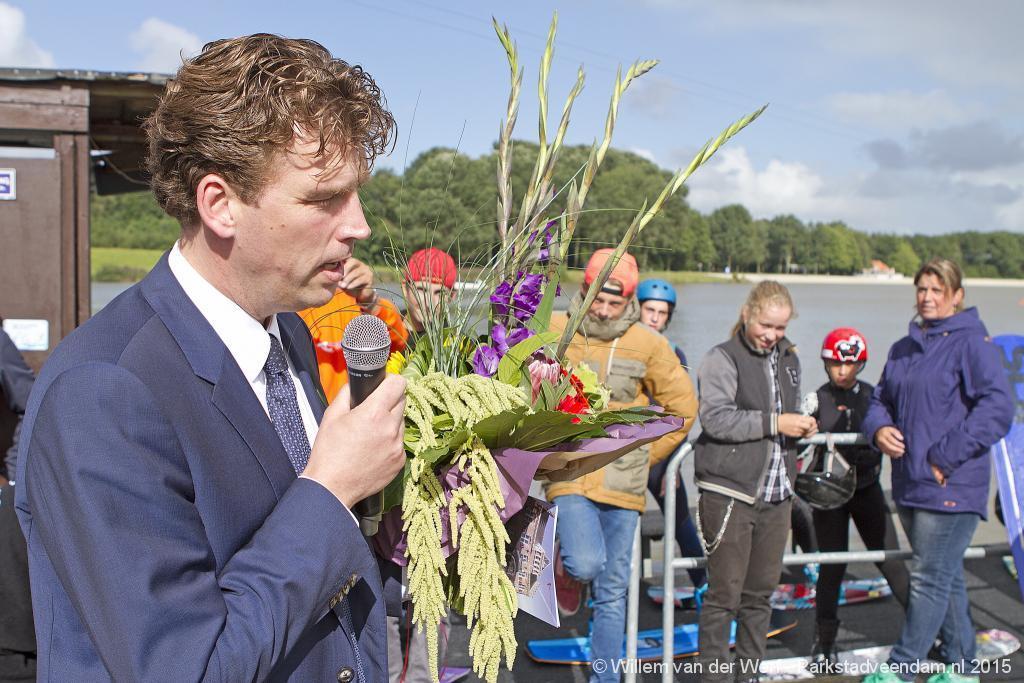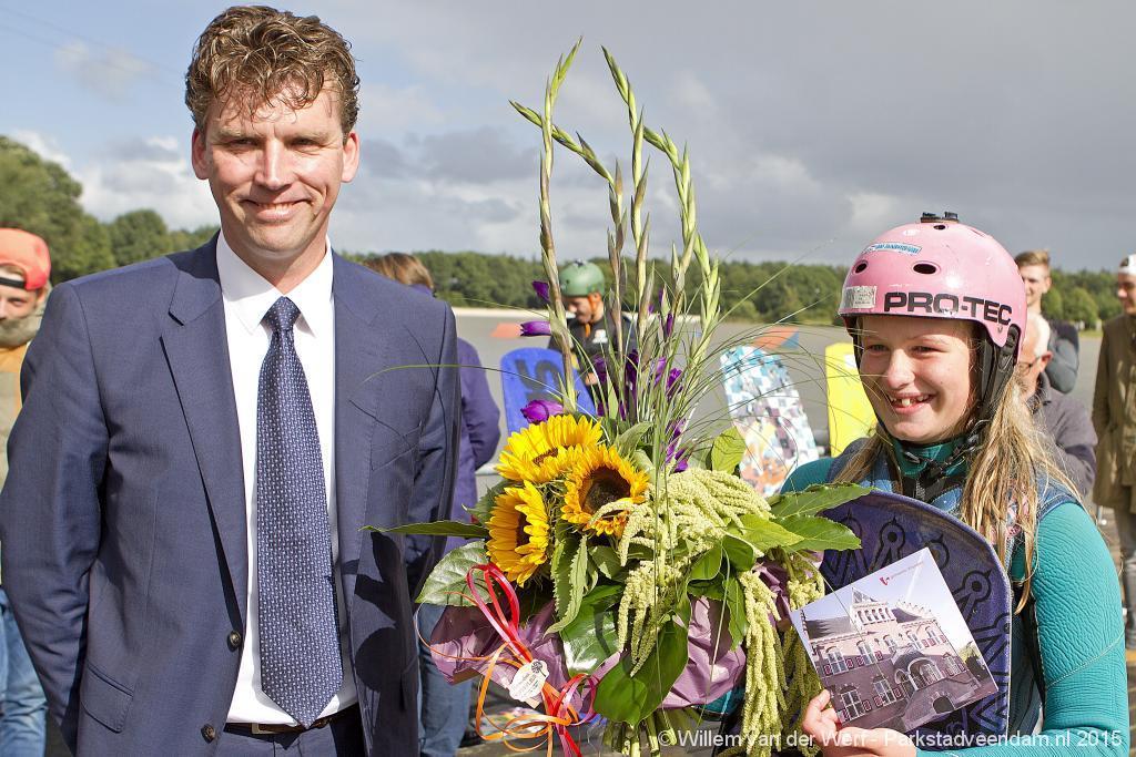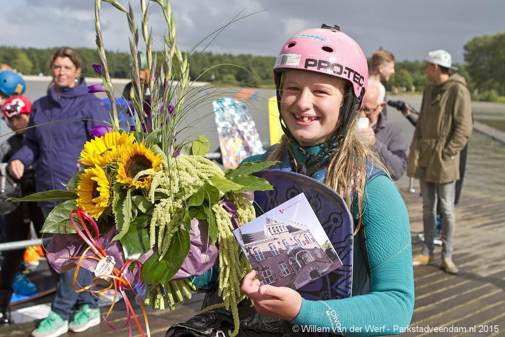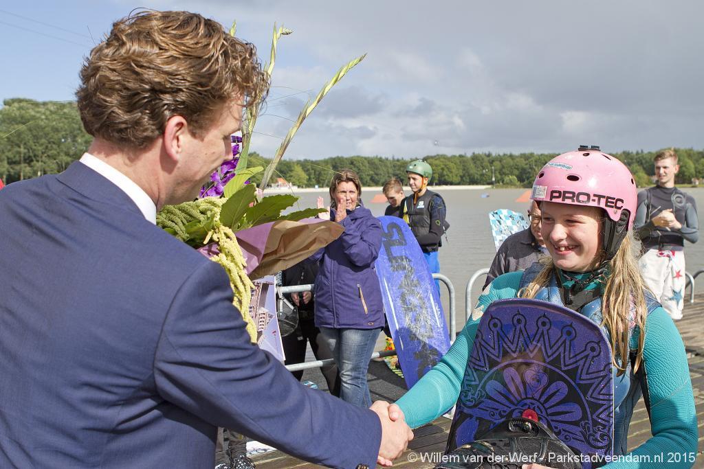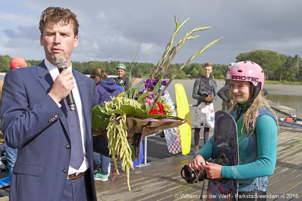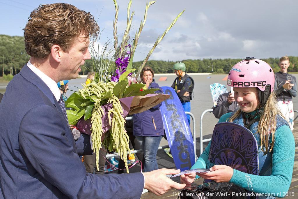WAKEBOARDEN - Afgelopen zaterdag werd wakeboarster Iris van Suchtelen van de Haare in de bloemetjes gezet op de waterskibaan in Veendam. Wethouder Henk Jan Schmaal van de gemeente Veendam mocht de kersverse Nederlands kampioen een fraaie bos bloemen over handigden. Daarna waren de felicitaties niet van de lucht. De 13-jarige Iris van Suchtelen de Haare is Nederlands kampioen wakeboarden geworden.