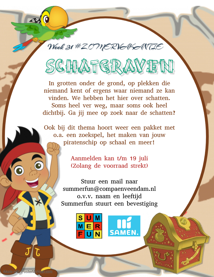 Meedoen aan deze activiteit is gratis dankzij een bijdrage van het Nedmag SAMEN-fonds. Het is geen Jong&Oud activiteit. Dat betekent dat u uw kind/kinderen brengt en daarna weer ophaalt. De activiteit is geschikt voor kinderen vanaf 6 jaar. Aanmelden voor de activiteit kan door een mail te sturen naar summerfunveendam@hotmail.com o.v.v. naam en leeftijd. Summerfun stuurt een bevestiging.