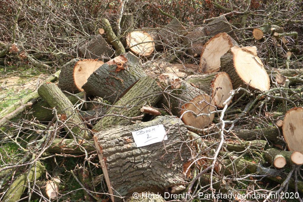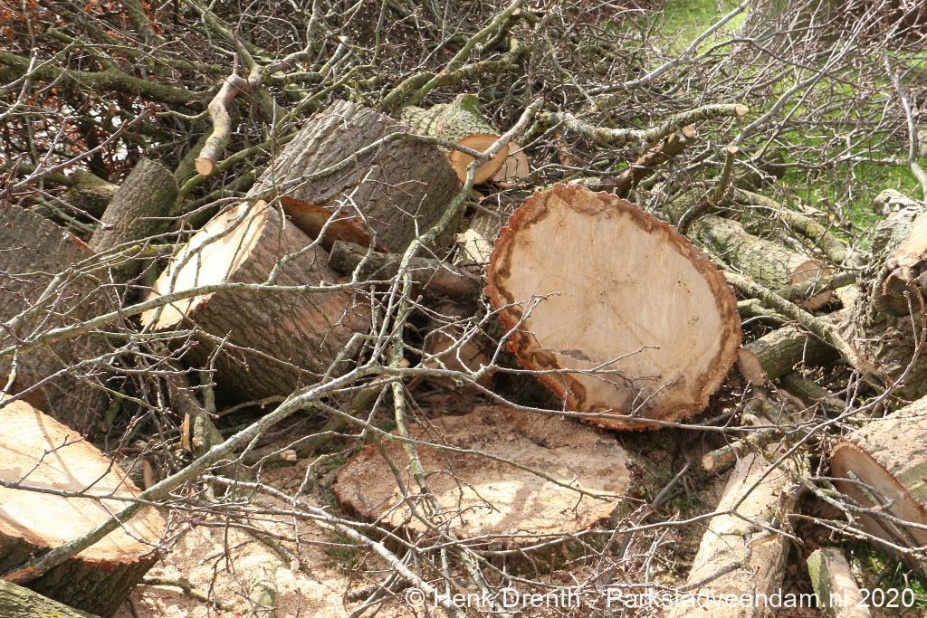 De onbruikbare takken worden door de gemeente versnipperd. De stukken stammen, met van beide bomen ongeveer 6 kuub, worden achter de boerderij van een vrijwilliger gebracht. Men denkt aan het online verkopen via Marktplaats.