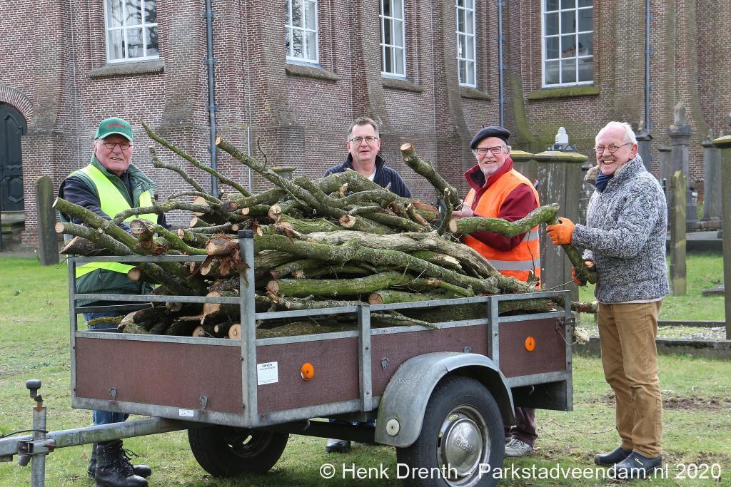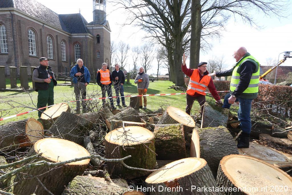 Secretaris Henk Robben: “Het snoeiproject heeft 12.000 euro gekost. Landschapsbeheer Groningen heeft het snoeiwerk aan de bomen rondom het kerkhof uitgevoerd. Landschapsbeheer heeft ook de twee eikenbomen omgezaagd en de stammen in kortere stukken verdeeld.”