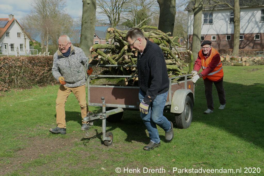 Stichting Voordoor heeft twee aanhangwagens vol haardhout voor de open haard van de ontmoetingsruimte gehaald. Alex Schepel en Henk Meijer van de stichting was met drie vrijwilligers aanwezig. "Met vijf weken is het weer op". Het moet eerst twee jaar drogen, en dan moet het worden gekloofd.
