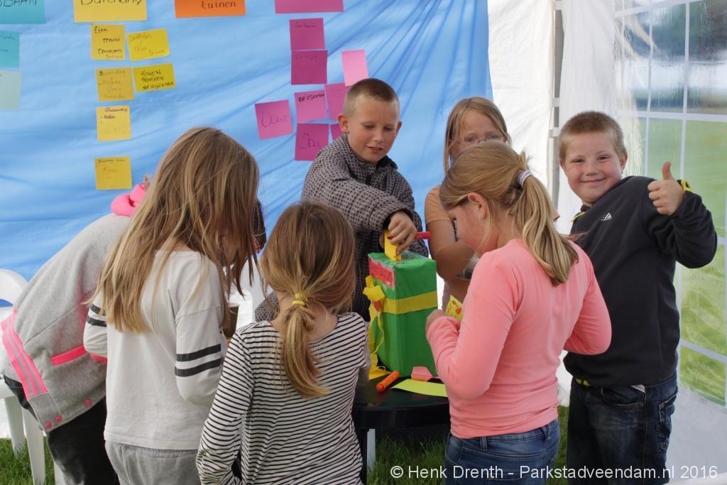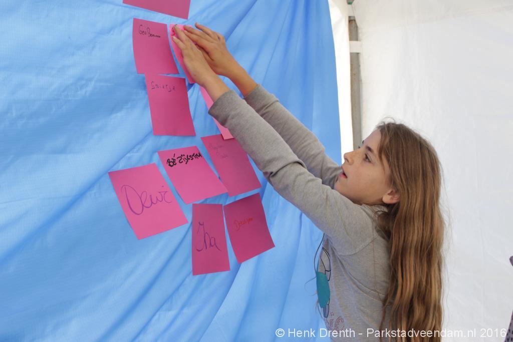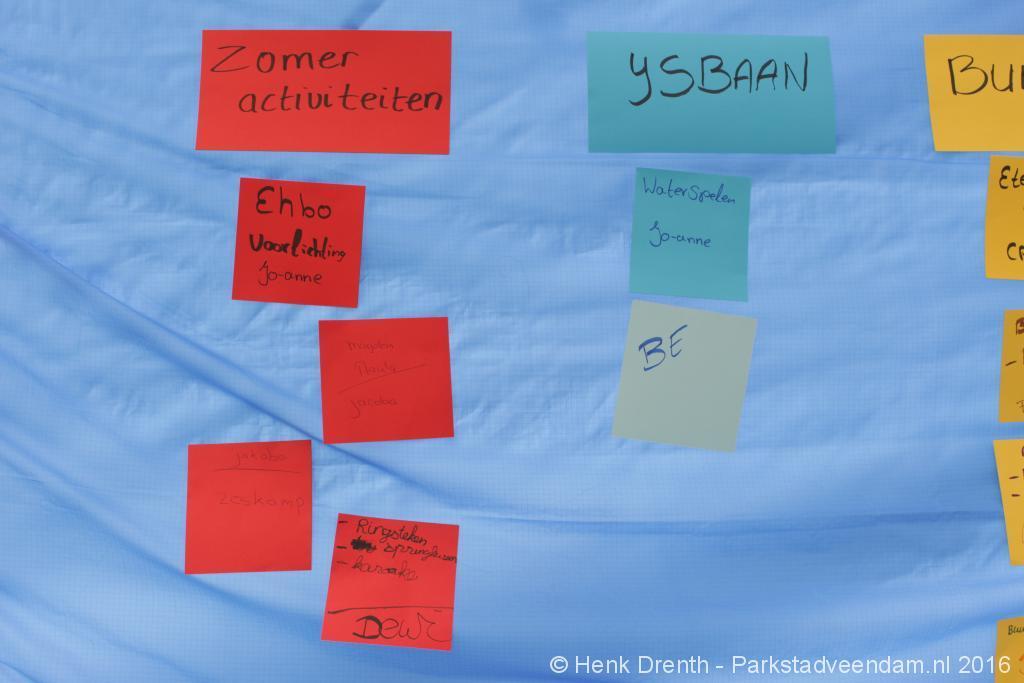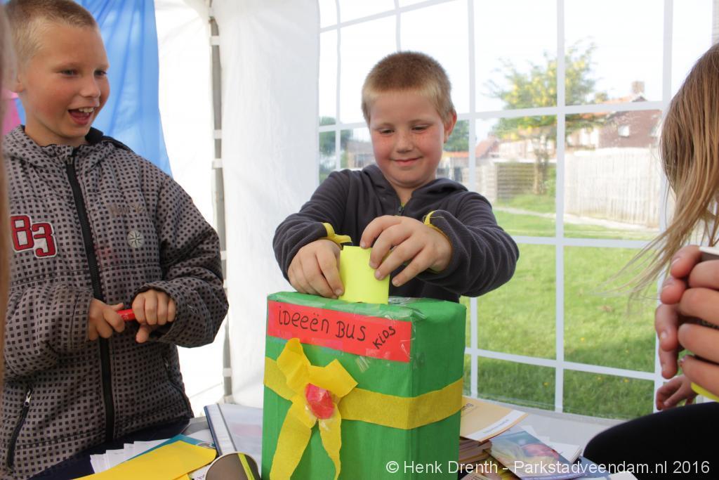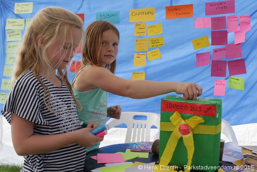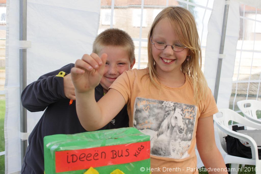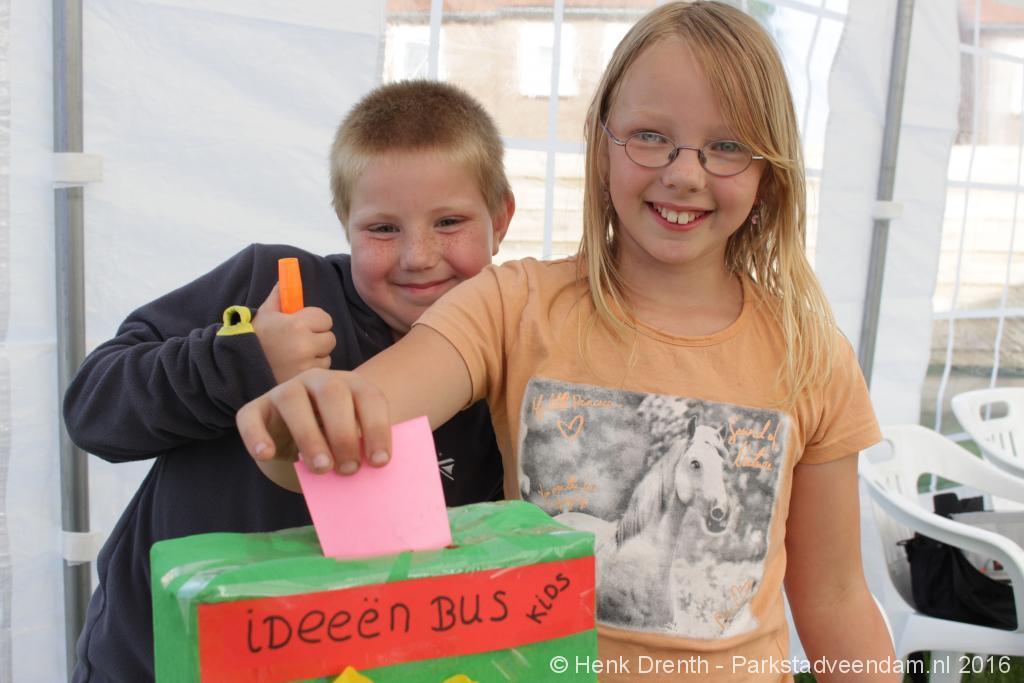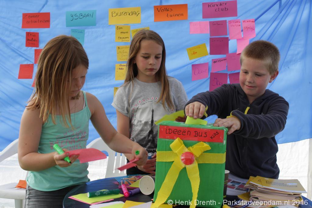 De kinderen vermaakten zich op een luchtkussen, maar de ideeënbus was ook bij hen zeer in trek om allerlei wensen in te dienen. Charel van 6 jaar zou het leuk vinden als er een kinderdisco komt. Een kabelbaantje werd ook veelvuldig genoemd, het vond veel aansluiting. Damian ziet wel wat in een grote familieschommel. Kaylee heeft aangegeven dat ze een danstalent is. Zij zou graag een dansveldje willen zien waar ook workshops kunnen plaatsvinden.