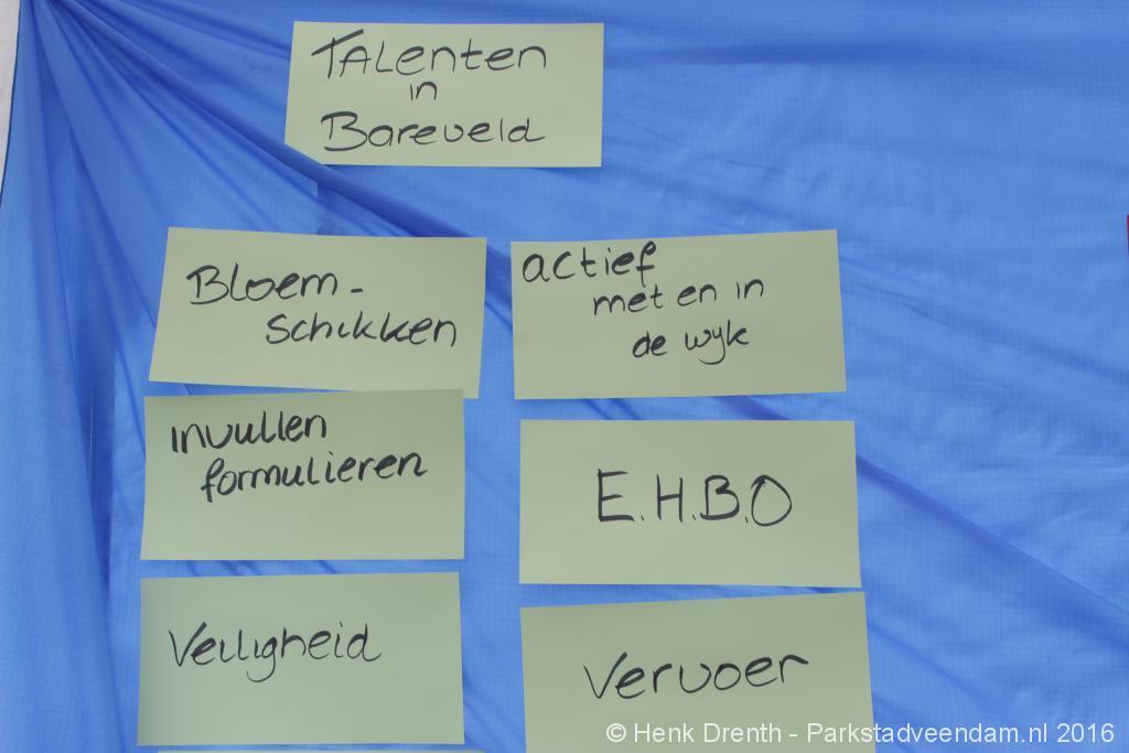 Vorig jaar heeft buurtwerker en wijkcoördinator Jantien Landman met de buurtwerkers Sina de Jong en Jolanda Rozema een enquête in Bareveld gehouden om te kijken welke talenten er allemaal zijn. In de enquête hebben de wijkbewoners ideeën ingebracht. Afgelopen donderdagmiddag is in een tent aan de Pijlkruidstraat een bewonersbijeenkomst geweest op het grote speelveld om terugkoppeling van de uitkomsten te geven van de enquête. Tijdens deze bijeenkomst met een hapje en een drankje was ook een ideeënbus neergezet waar ook veel gebruik van is gemaakt.