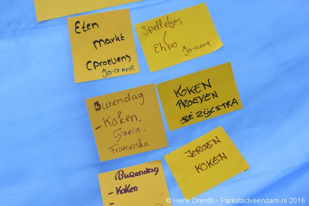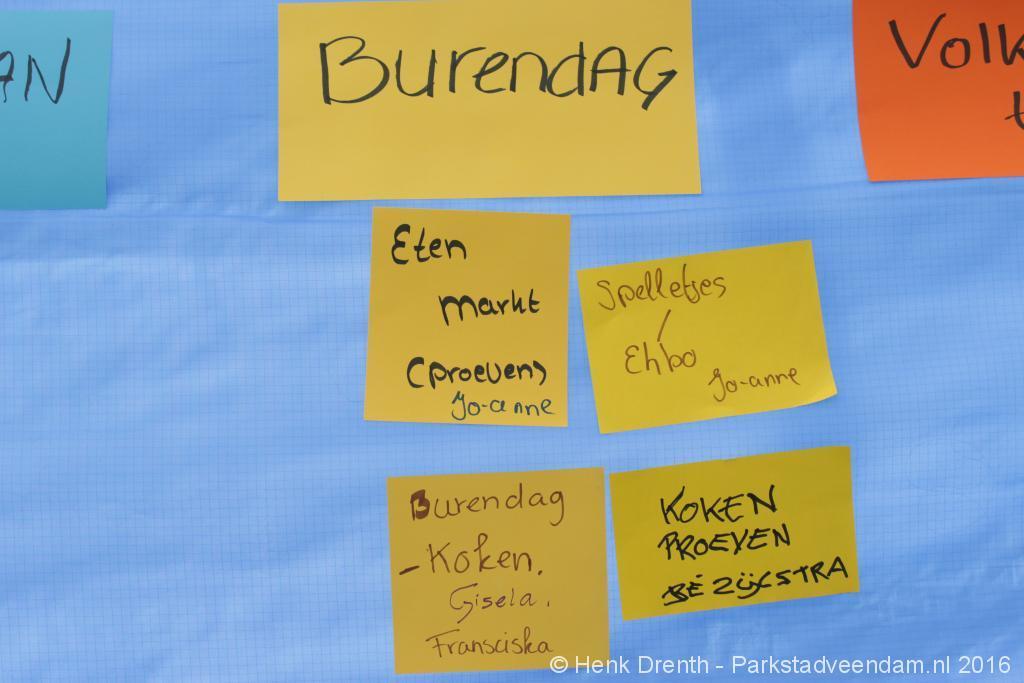 Jeroen en Bé waren met het idee gekomen om tijdens de landelijke Burendag gezamenlijk te koken, met ook daarbij een markt en een proeverij. Iedereen zou dan iets lekkers kunnen maken waar hij of zij heel goed in is, en dat gaan samenbundelen. Het kreeg veel bijval, en zeven kooktalenten hebben zich er al voor opgegeven. Voor het houden is de landelijke Burendag bij uitstek geschikt daarvoor. Na het indienen van een plan van aanpak kan men vaak 250 euro subsidie krijgen voor het organiseren. De landelijke Burendag is dit jaar op 24 september. “Volgende week wordt er al over gebrainstormd” verteld Jantien. “In principe gaan ze het zelf doen, maar als iets niet lukt en ergens op vastlopen kunnen de buurtwerkers bij gaan springen”.