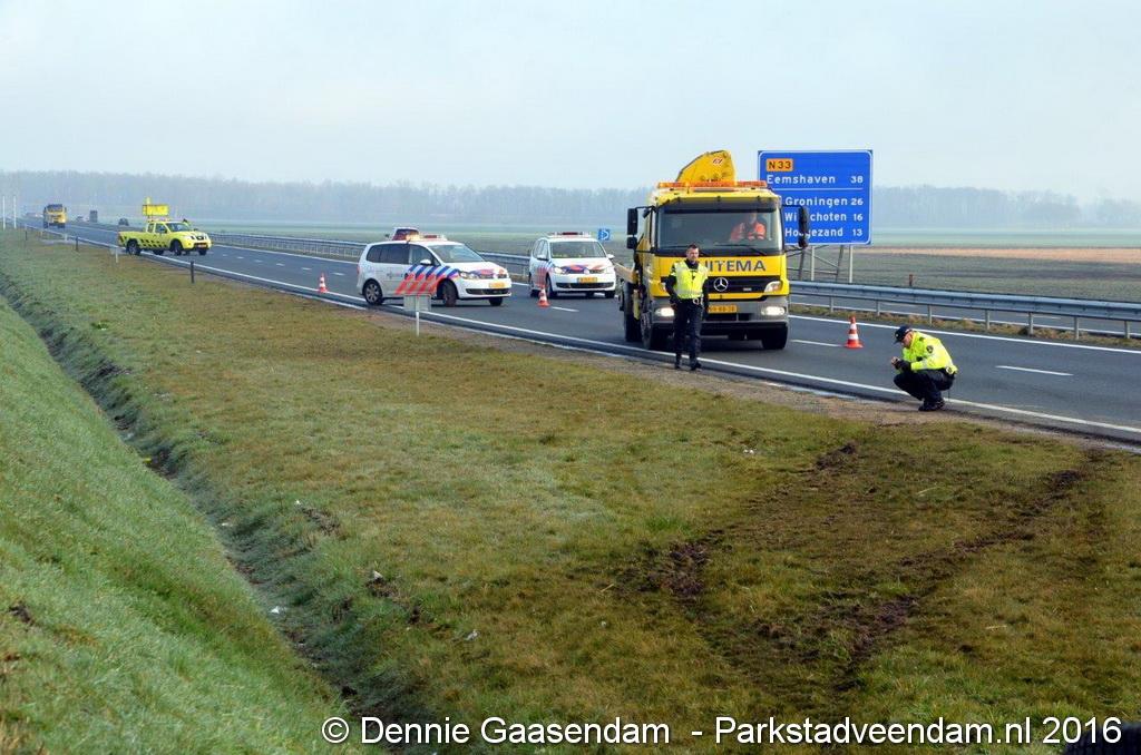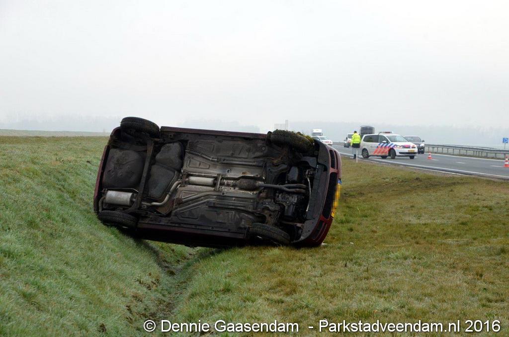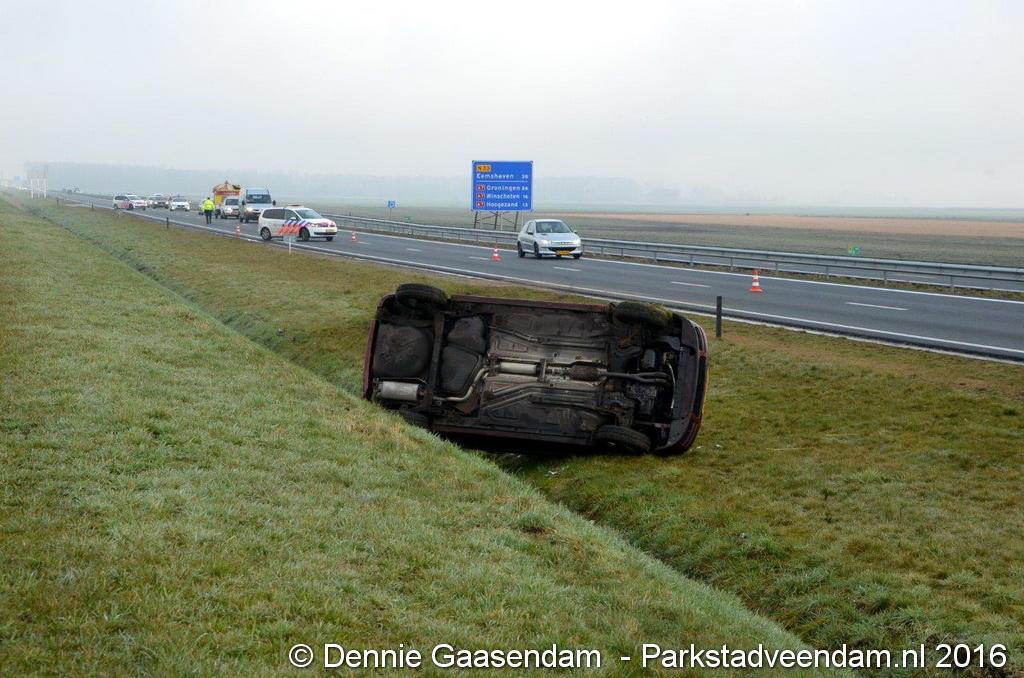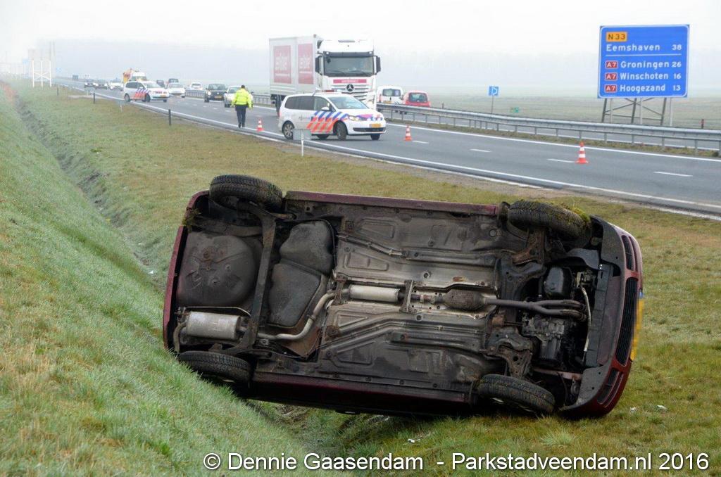 MUNTENDAM - Zaterdagmorgen is op de N33 tussen de A7 en Muntendam / Meeden een auto van de weg geraakt en over de kop geslagen.
