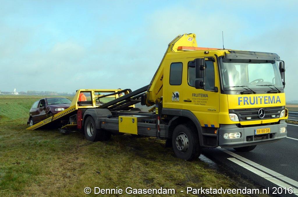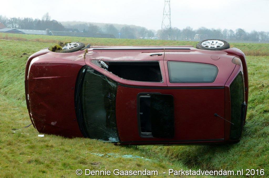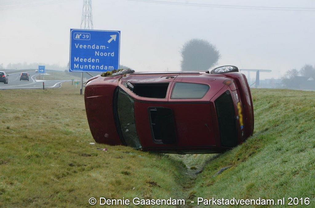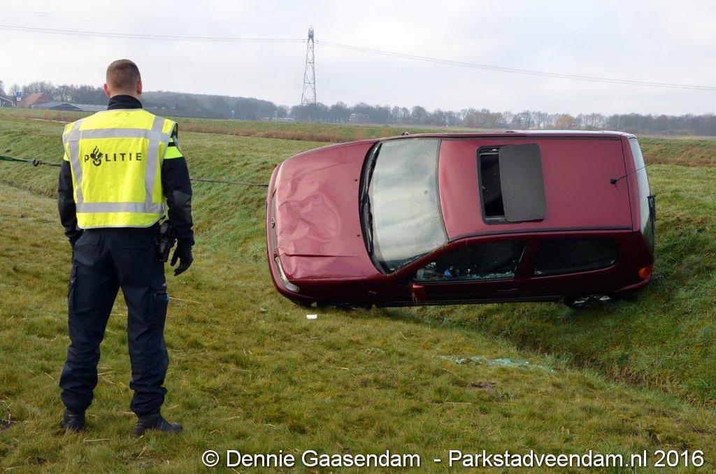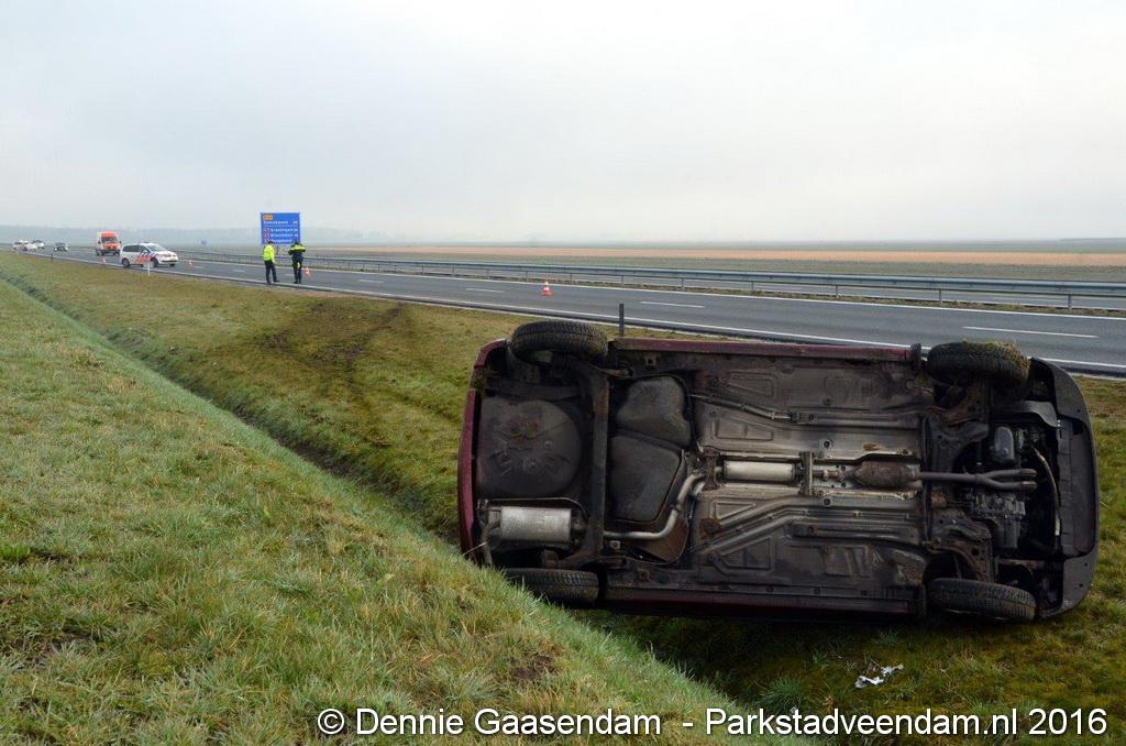 MUNTENDAM - Zaterdagmorgen is op de N33 tussen de A7 en Muntendam / Meeden een auto van de weg geraakt en over de kop geslagen.