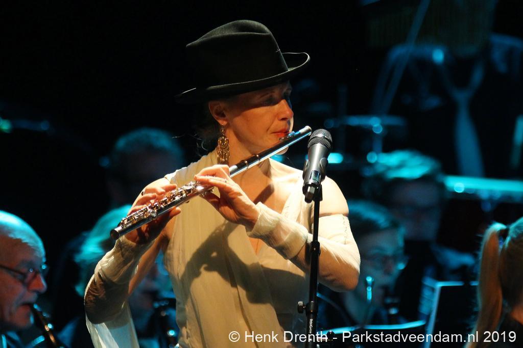 Muziekvereniging Voorwaarts was dan ook goed op dreef. De Vlaamse schone wist de zaal goed te bespelen door op een onderhoudende manier naast haar zang afwisselend  dwarsfluit te spelen en te dansen. De zangeres werd vergezeld door de Nederlandse top bastrombonist Jos Jansen. Hij soleerde de sterren van de hemel.