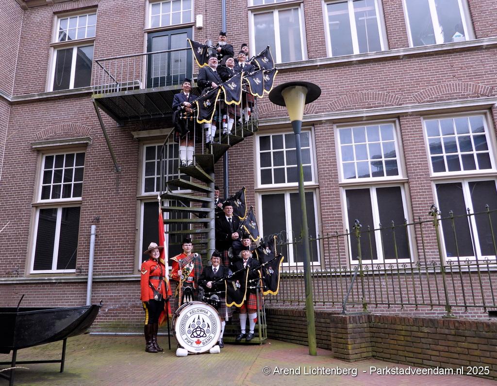 Zondagmorgen werden de 80 leden van de Kelowna Pipe Band uit Canada op het gemeentehuis van Veendam ontvangen door burgemeester Annelies Pleyte en wethouder Henk Jan Schmaal.