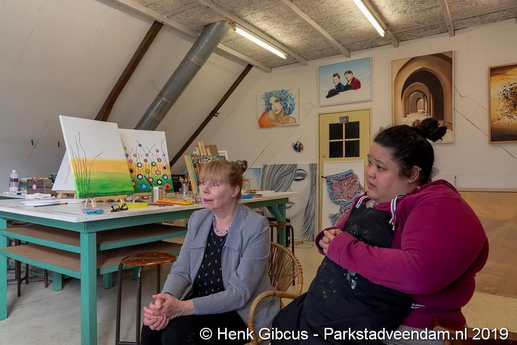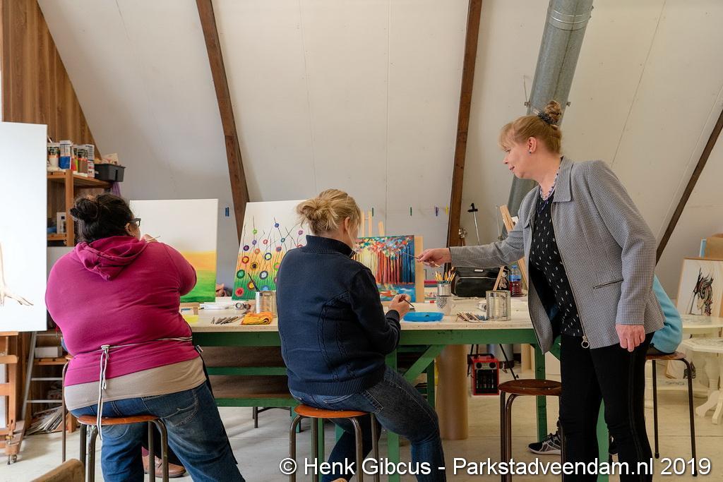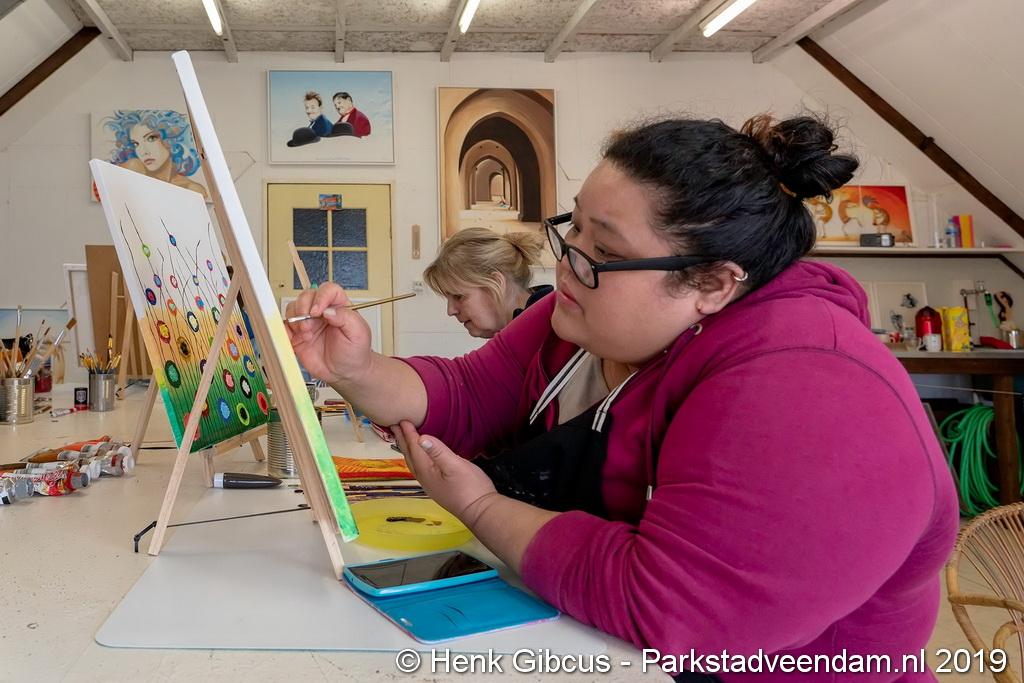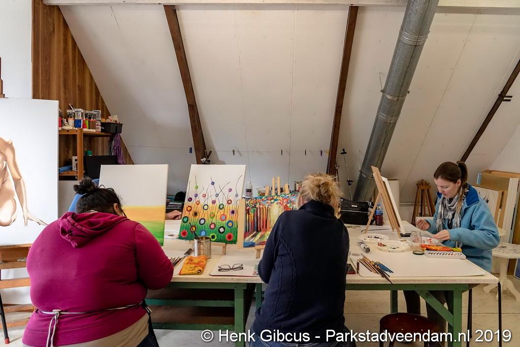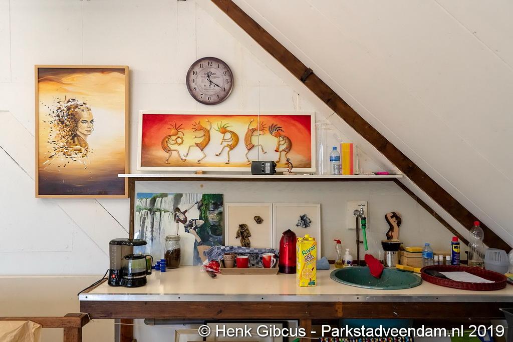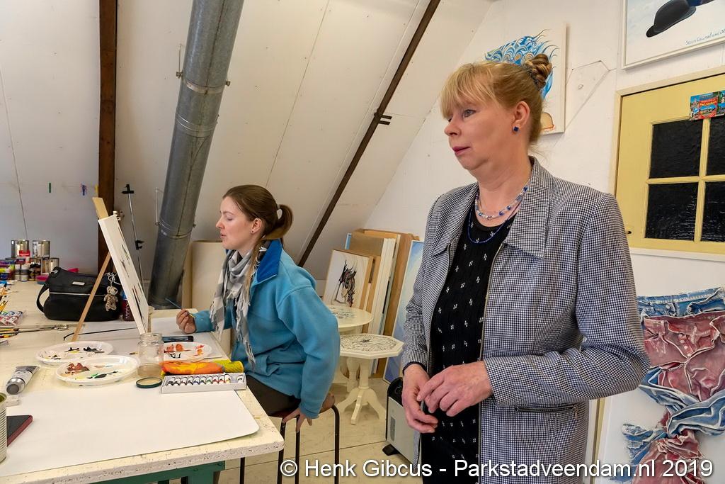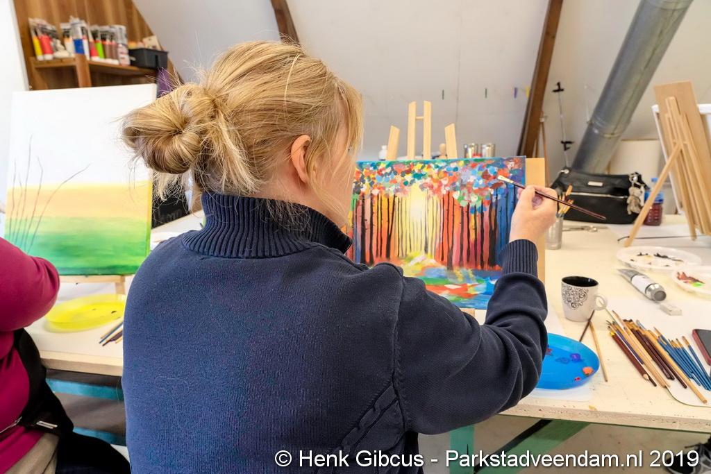 Aafke en Jaap wonen al 30 jaar aan de Wildervanksterdallen in een grote boerderij – Galerie De Vier Linden op nummer 69. In het voorhuis is op de verdieping een ruimte gecreëerd waar Aafke haar lessen verzorgt. Iedere dinsdag- en zaterdagochtend zijn een aantal cursisten daar aan het werk. “We beginnen altijd met een stukje kunstgeschiedenis bijvoorbeeld het monument op de Dam van John Rädecker of Het Peerd van Ome Loeks. Vervolgens gaan we inhoudelijk in op de verschillende technieken. Hoe schilder je de horizon en waar komt die op het doek? Schaduw, het mengen van kleuren, van welke kant komt het zonlicht, welke materialen kun je gebruiken enz. enz. passeren de revue. Dan gaat iedereen met zijn eigen werk aan de slag. Het is reuze gezellig, er staat géén druk op het werk, het is niet klassikaal en heel ongedwongen. De groepsgrootte is maximaal 6 personen en de leeftijd varieert van eind twintig tot tachtig én zowel man als vrouw. Eindtijd is 12.00 uur, maar vaak is het zo gezellig dat het zomaar uitloopt.” Voor € 12,50 krijg je een hele ochtend les incl. koffie met wat lekkers en alle materialen. Kwasten en penselen worden ter beschikking gesteld en het eerste linnendoek zit bij de prijs in! Op de zaterdagochtend zijn er nog plaatsen vrij…