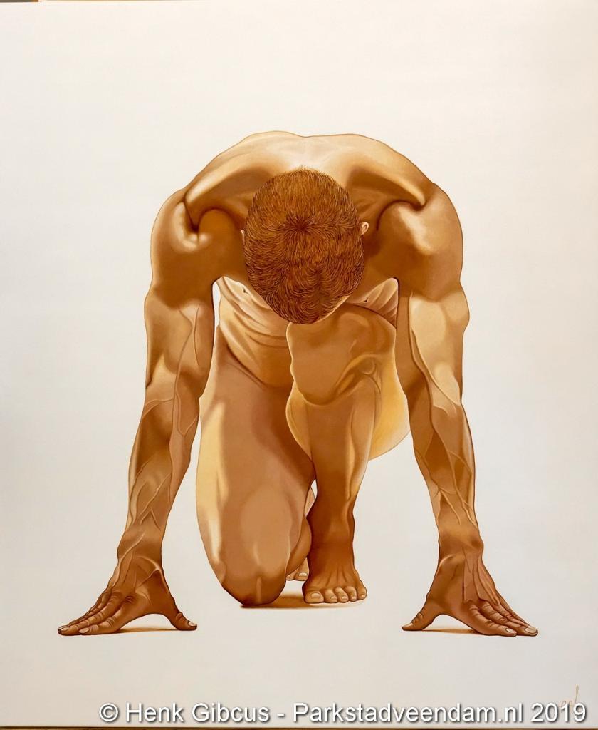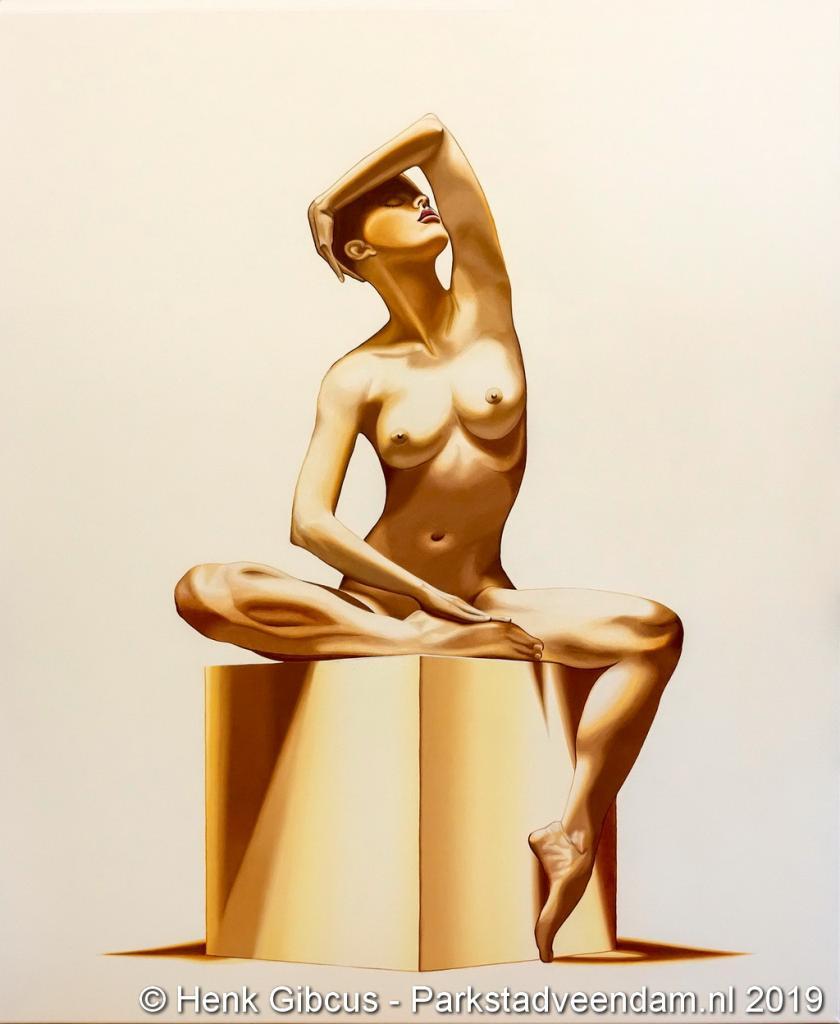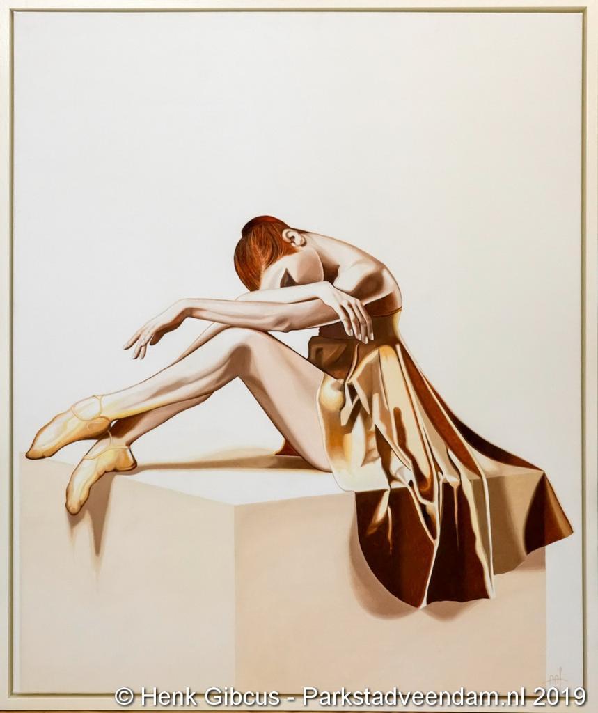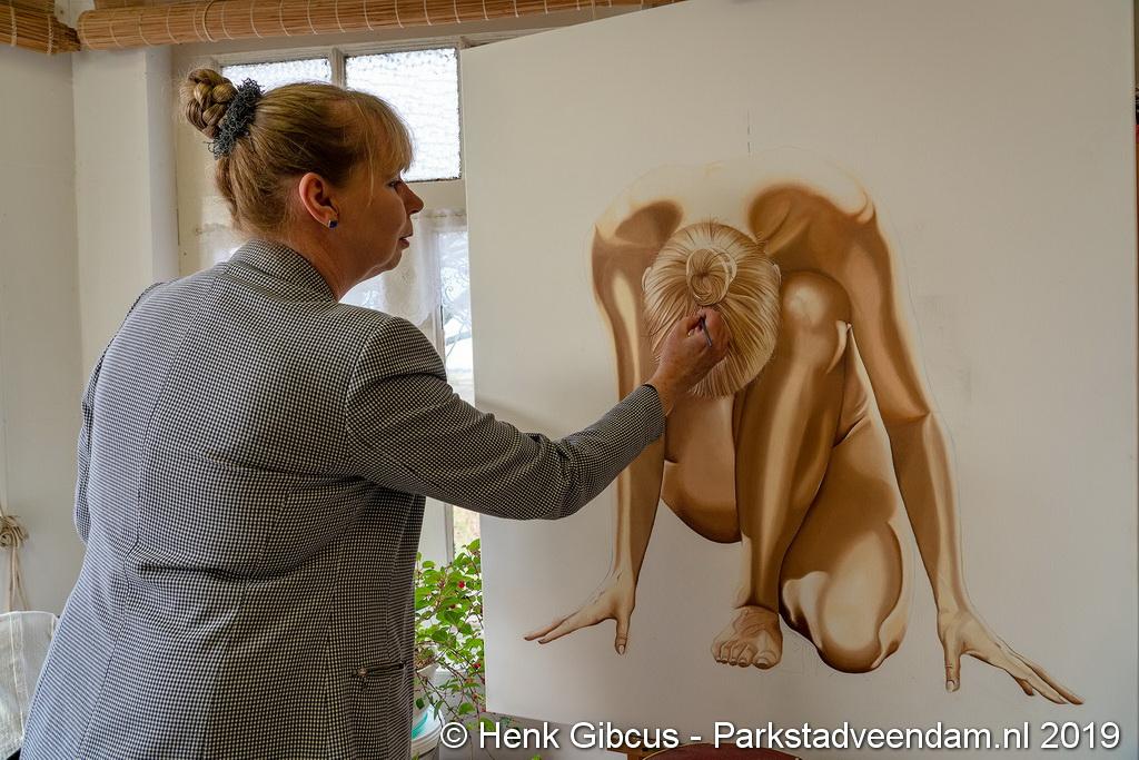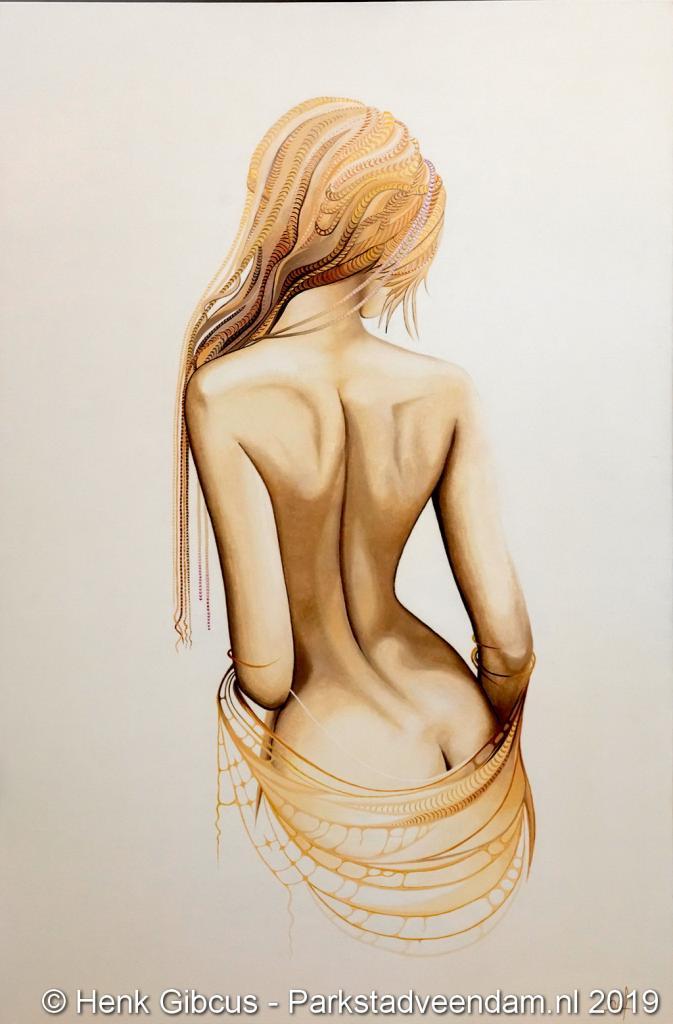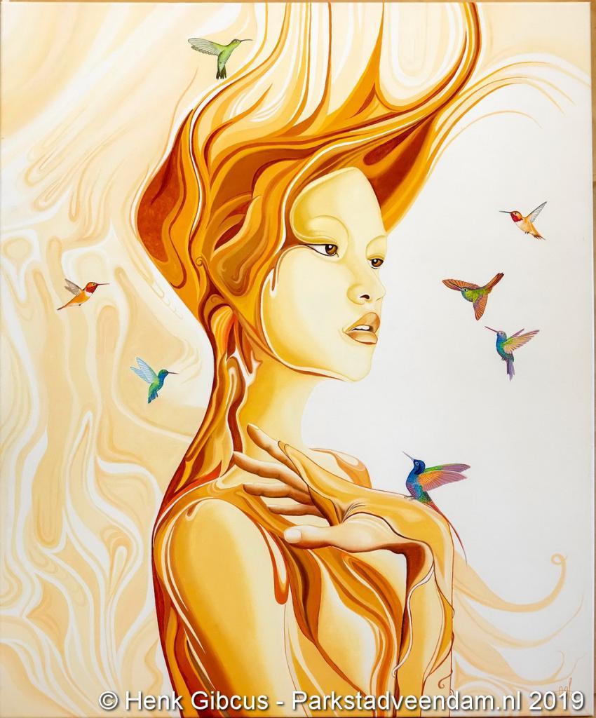 De schilderwerken van Aafke kenmerken zich veelal door vrouwenfiguren, waarbij het haar van de vrouw een hoofdrol speelt. Graag laat ze zich inspireren door kapperssites. “Vrouwen tonen zich daar op hun best, met fantasierijk kapsel,” verklapt Aafke ons. Andere inspiratiebronnen zijn Salvador Dali, Carel Willink en M.C. Escher. Momenteel werkt ze aan een schilderij waarop een vrouw is afgebeeld in een starthouding (atletiek). Het gezicht is naar beneden gericht, waarbij het kapsel dus alle aandacht krijgt. De sportieve houding vereist ook een idem haardracht. Het is dan ook een lekker kort koppie. Goudkleurig is het lichaam. Het haar krijgt een bijpassende uitstraling. Aafke heeft iets met haar. Kleine schilderijen schildert ze op linnen, grote stukken veelal op canvas. Hierbij denken we toch wel aan maten van meer dan 1 m². Ook het schilderen op paneel en met olieverf, acrylverf of een mix van beide is haar op het lijf geschreven. De schilderijen stralen gevoel, emotie en schoonheid uit. Ze zijn van de ene kant ingetogen en van de andere kant toch sprankelend. Magisch realistisch zoals ze het zelf zegt.