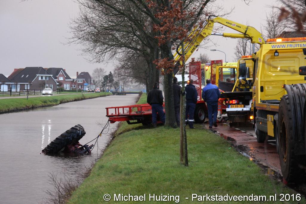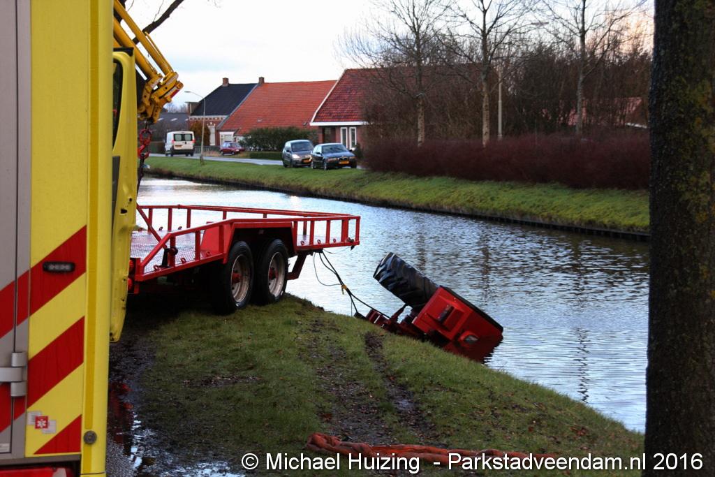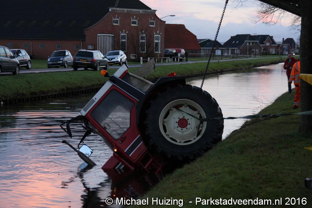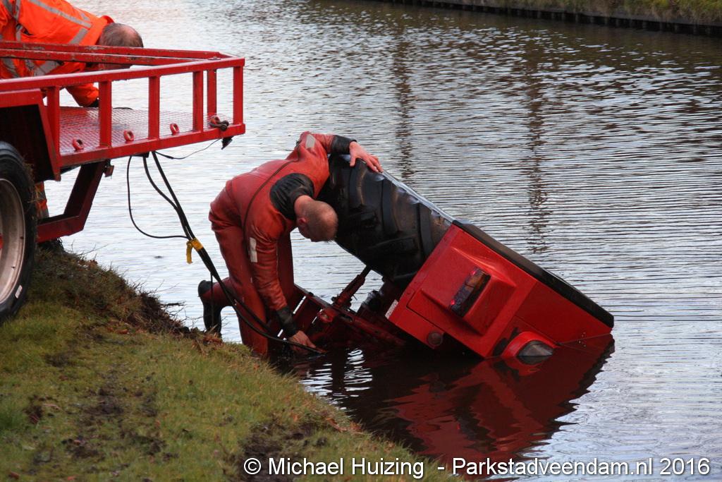 NIEUWE PEKELA - Dinsdag aan het eind van de middag is een tractor te water geraakt aan de Tilstraat in Nieuwe Pekela. Alle hulpdiensten werden gealarmeerd waaronder de duikers uit Groningen. Bij aankomst van brandweer Nieuwe Pekela bleek dat de bestuurder inmiddels veilig aan de kant stond en werden de duikers geannuleerd. Berger Fruitema heeft in combinatie met een grondverzetbedrijf de tractor weer op het droge getakeld.
