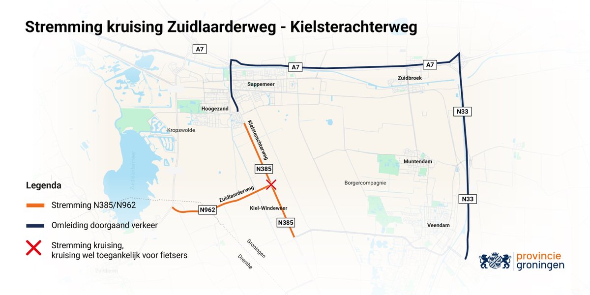 Weggebruikers moeten vanaf 18 augustus a.s. rekening houden met een afsluiting van de kruising Zuidlaarderweg en Kielsterachterweg (N385). Tot en met 12 september is de kruising volledig gestremd vanwege de aanleg van een veilige fietsoversteek.