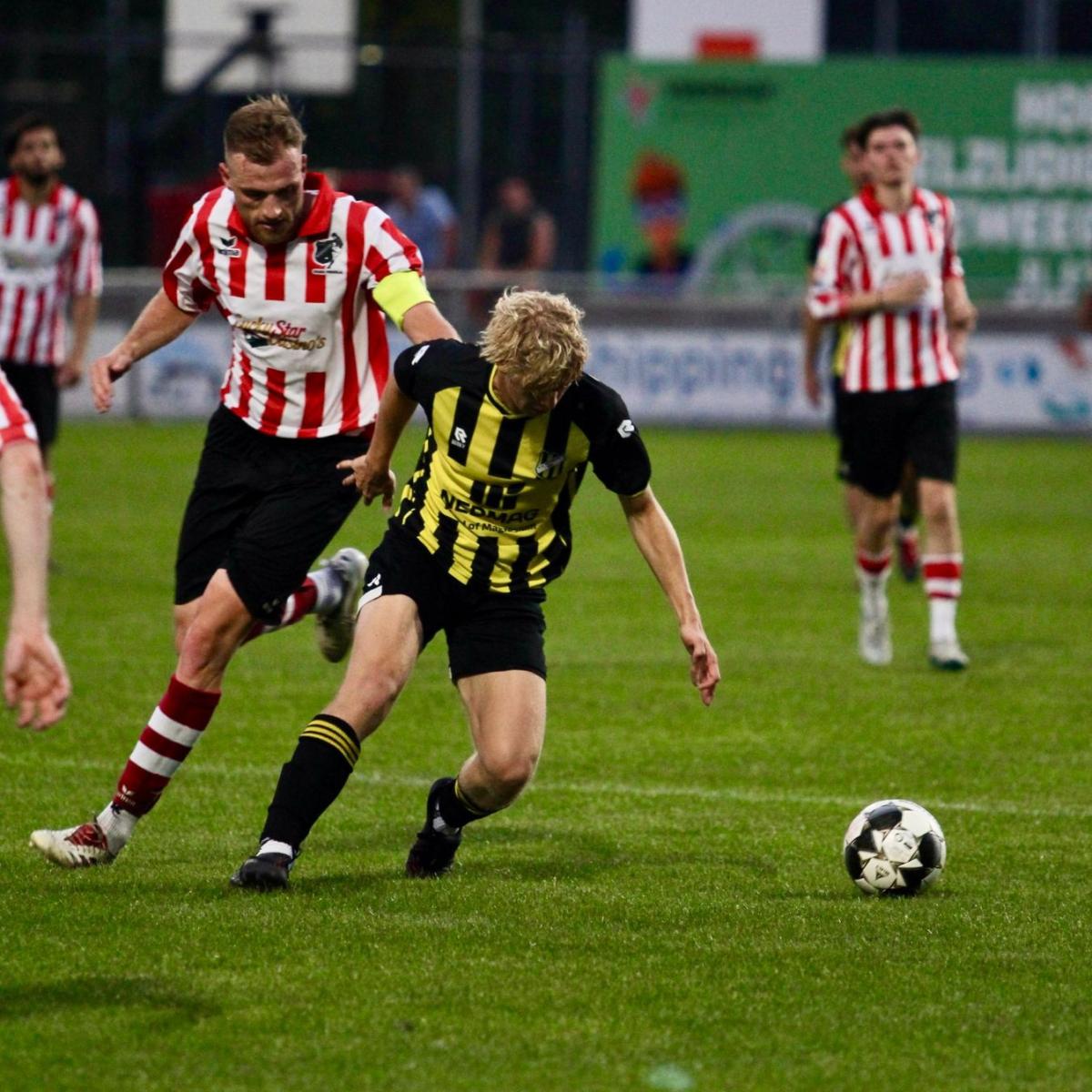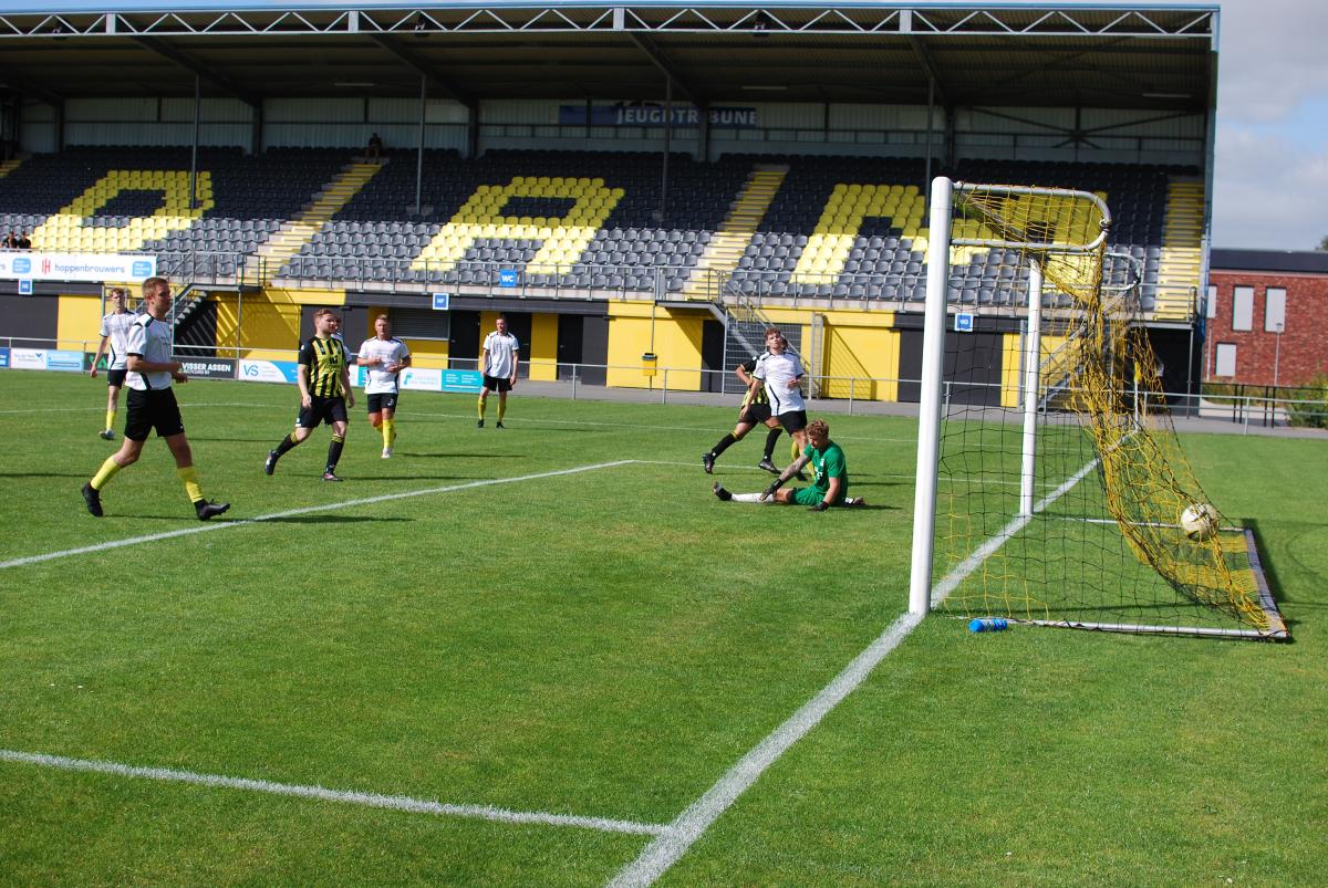 De selectie werd opgesplitst in twee teams waarbij de blauwzwarten (reservetenue) sparden met de geelzwarten. In het oefenduel zegevierden de geelzwarten met 4-1 door doelpunten van Dinand de Jonge (2x), Dion Beks en Twan Sanders. Namens de blauwhemden knalde Winston de Jonge de bal (1-1) tegen de touwen. Lorenzo Langeland spelend bij de hemelsblauwen zag een penalty gestopt worden door doelman Roy Mos. Aan de andere kant onderscheidde keeper Thijs Graver zich een paar keer door enkele nuttige intercepties. Het was mooi om te zien dat na lang blessureleed Koen Kort weer zijn eerste wedstrijdminuten maakte.