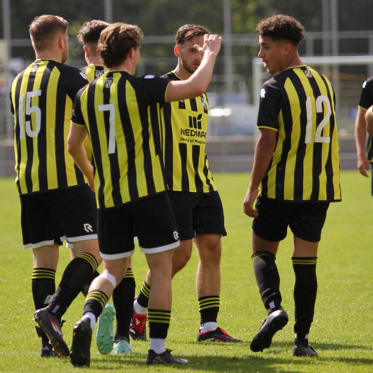 Na een intensieve eerste trainingsweek kwam de mannenselectie van Veendam 1894 op een warme zomerse zaterdagmiddag van 9 augustus 2025 op het kunstgrasveld in actie voor een onderling oefenwedstrijdje. Hoewel een gedeelte van de spelersgroep van hoofdtrainer Armand Mac Andrew nog op vakantie is, kwamen er toch 22 selectiespelers op het veld. Aangevuld met enkele talenten uit JO-17 en JO-19 ontstond er een interessant oefenpotje. Omdat er ’s ochtends ook al getraind was, werd besloten dat het onderlinge partijtje 2 x 30 minuten zou duren. De belastbaarheid van de spelers werd  in die zin goed gemonitord. Halverwege het vriendschappelijk duel liet de scheidsrechter van dienst, liefhebber en onder meer oud-voorzitter van Telstar en de huidige voorzitter van de RvC van FC Groningen Jakob Klompien, mij weten dat hij ‘mooie dingen had gezien’.