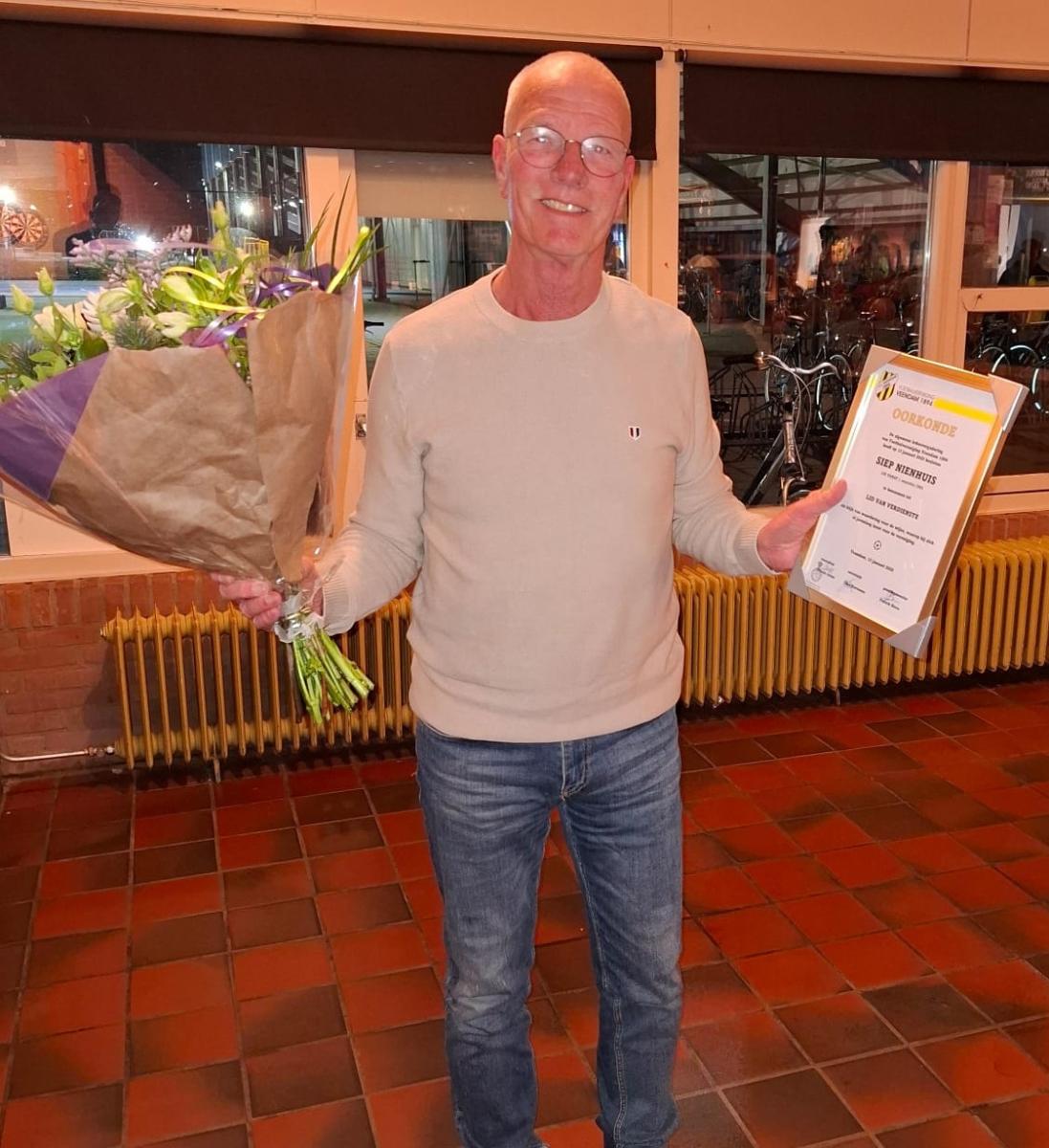 Daarnaast is Siep geliefd binnen alle geledingen van de club om zijn vriendelijke, sociale en benaderbare karakter. Kortom: als iemand deze onderscheiding verdient, dan is het Siep Nienhuis. Vanzelfsprekend hopen wij dat ons clubicoon nog tot in lengte van jaren blijft verbonden aan onze club, in welke hoedanigheid dan ook, aldus het bestuur van Veendam 1894.