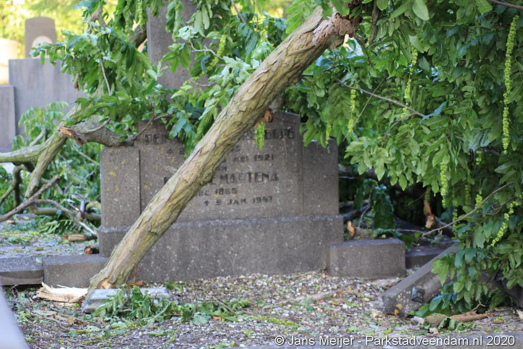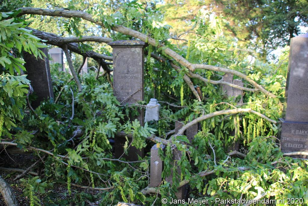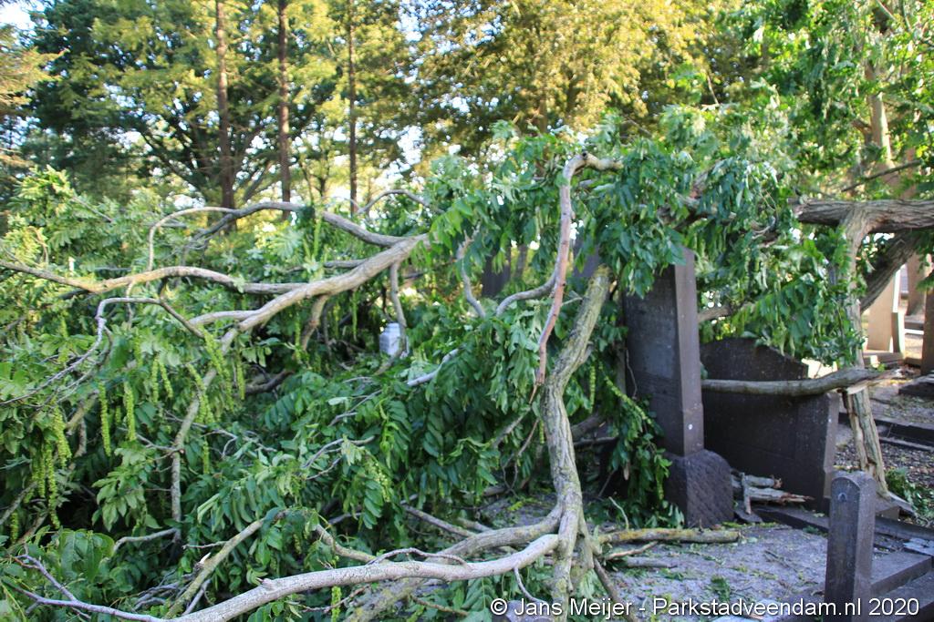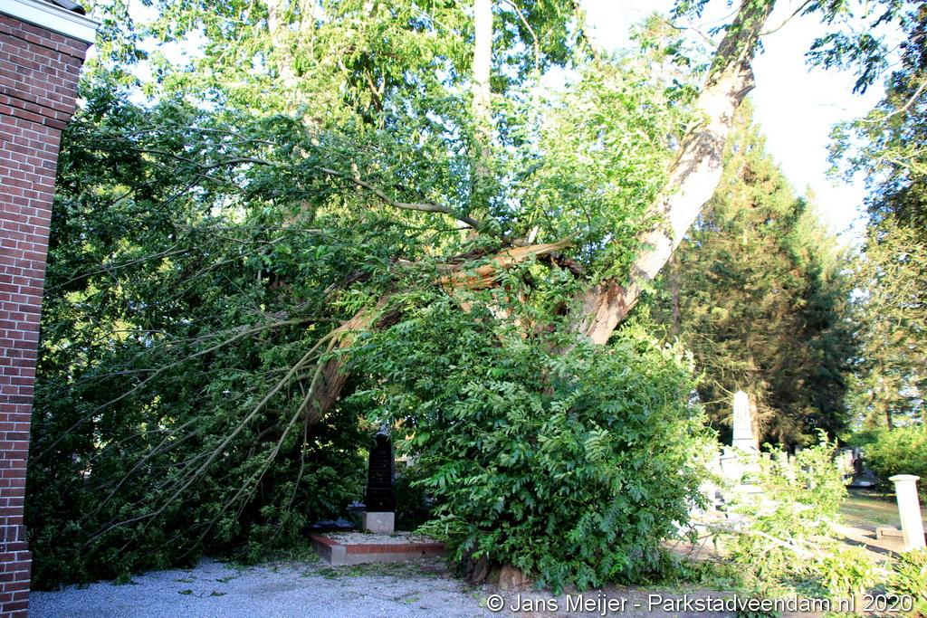 Een door bliksem getroffen boom heeft zaterdag tijdens het noodweer voor de nodige schade gezorgd op het kerkhof aan de Dalweg in Wildervank.