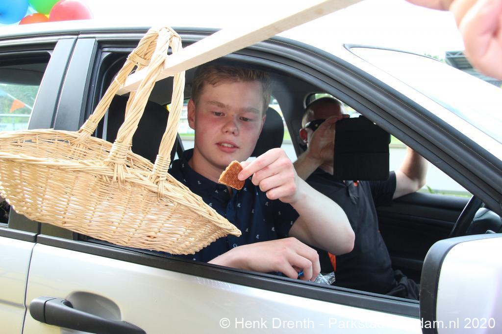 In de auto legden de leerlingen een feestelijk traject af langs tussen de tribune en het voetbalveld. Er wachtte hen een ingetogen programma, maar tegelijk uitbundig waar dat kon binnen de passende coronamaatregelen. De eindexamenleerlingen wisten met hun familie in de auto niet wat er precies ging gebeuren. Zo'n vijftig vrijwilligers, docenten en conciërges, zorgen bij vijf stands voor een warm en feestelijk onthaal. Ook de auto’s kregen met ballonnen een feestelijk tintje.