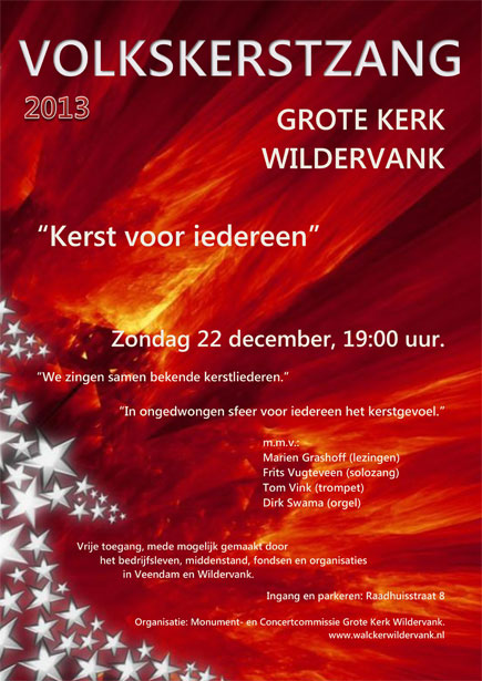 KERSTZANG - Na het grote succes van de Volkskerstzang in 2012 en de enthousiaste reacties van vele mensen organiseert de Monument- en Concertcommissie Grote Kerk Wildervank ook dit jaar weer een Volkskerstzang. Het begin van een nieuwe traditie.