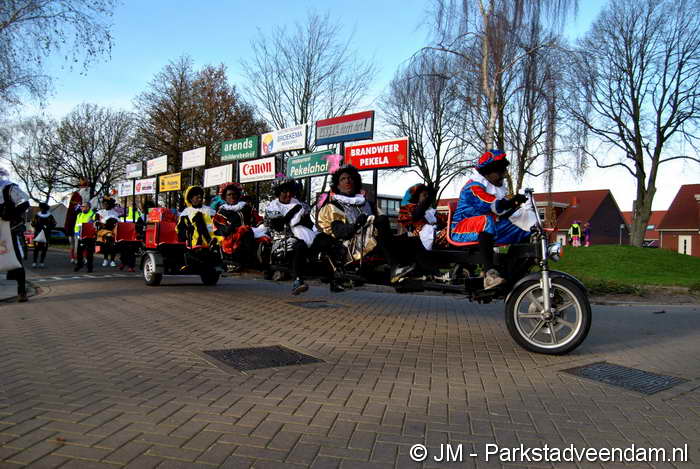 In de straten van ‘plan West' werd de optocht door draaiorgel ‘De Stolwijker' uit Assen vooraf gegaan. Een soortement lange fiets in de stoet werd door 34 pietenbenen voortbewogen. Onderweg bleek een van de drie banden onder onvoldoende luchtdruk te staan, en moest de ‘bandenpiet' er nog even met de fietspomp bij. Het bochtenwerk moest ruim worden genomen, en voor het bruggetje bij de Westerschool was dit met veel manoeuvreren.