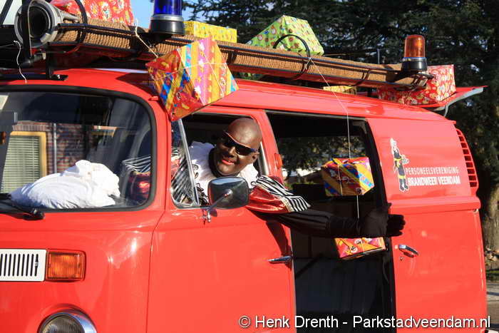 Voor het vervoer van de pieten was de paardentram weer uit stal gehaald, en ook het rode VW busje van de brandweer reed mee in de stoet. In de rode Lomax van de heer Venema had een piet een mooie seat gevonden. De nieuwe burgervader Swierstra had de zaterdag ervoor tijdens de intocht in Veendam een mooi plekje in deze open auto.