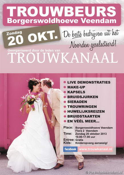 TROUWEN - Zondag 20 oktober wordt er een gezellige bruidsbeurs georganiseerd in de Borgerswoldhoeve in Veendam. Meer dan 23 enthousiaste bedrijven die allemaal lid zijn van Trouwkanaal doen mee aan deze beurs en presenteren zich tussen 11.00 en 17.00 uur aan toekomstige bruidsparen. Van de vakfotograaf tot limousineverhuur, van kleding tot bloemen en nog veel meer. Meer dan de moeite waard om een bezoek te brengen aan deze beurs met gratis entree!!