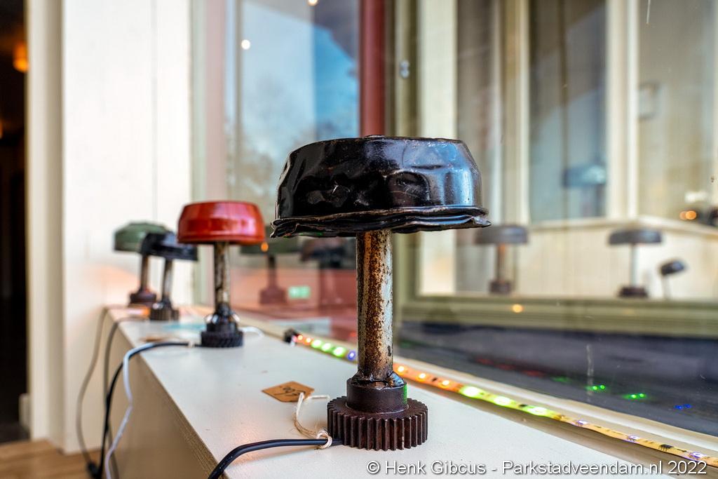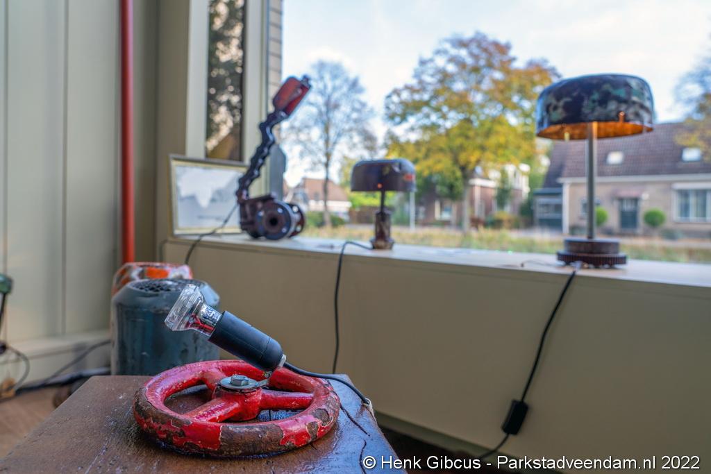 In de Turfcentrale aan de Molenstreek, broedplaats voor kunstenaars, heeft hij zijn eigen atelier waar hij sinds een aantal jaren zijn werkstukken maakt. Door de corona viel het theaterwerk en de escaperooms stil en richtte hij zich meer op deze werkzaamheden. Die lampen zijn in de meeste gevallen unica en variëren van wandlampen, tafel- en bureaulampen en sta-lampen. Hanglampen kan ook wel, maar die worden veelal te zwaar. En het is niet de bedoeling dat als je een lamp ophangt het plafond naar beneden komt…