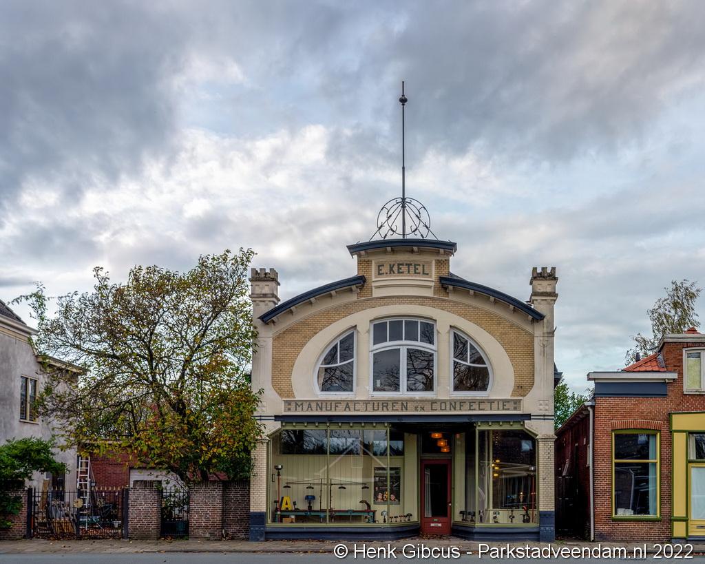 Ketel liet het pand bouwen tussen 1872 en 1874. Hij wilde met z’n tijd mee en verbouwde in 1910, onder architectuur van de bekende Veendammer architect J. Siccama, de voorgevel tot wat er anno nu nog staat met fraaie decoratieve elementen uit de Belle Epoque.