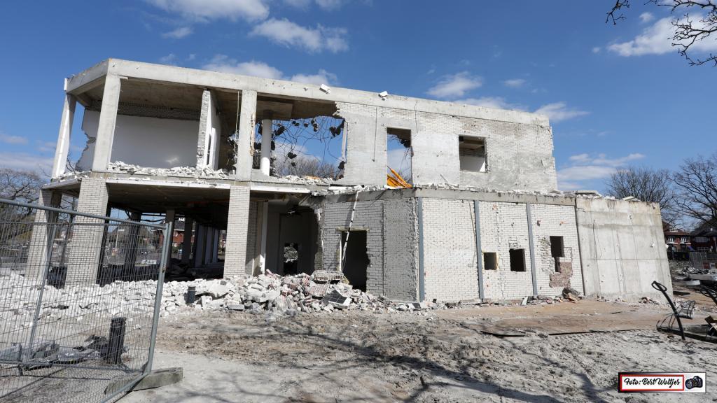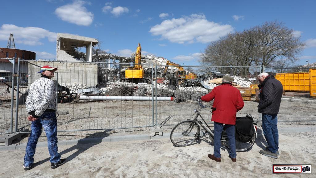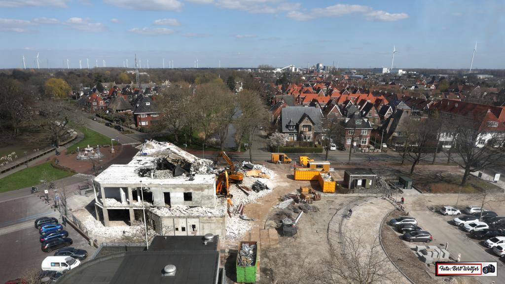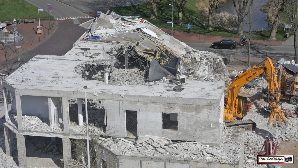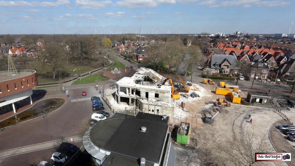 De sloop van het voormalige pand van de RABO bank vordert gestaag. Men is al een aantal weken bezig om het pand met de grond gelijk te maken. Het betonijzer wordt apart gelegd. Hout e.d. wordt ook verzameld en komt in gereedstaande containers terecht. Het zal nog wel een tijdje duren, want ook de funderingen moeten er nog uitgehaald worden.