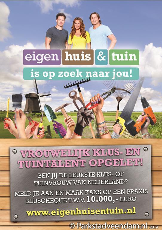 KLUSVROUW - Eigen Huis & Tuin gaat komend seizoen op zoek naar de leukste klus- en tuinvrouwen van ons land! Het wordt namelijk wel eens tijd dat vrouwelijk Nederland laat zien hoe handig ze zijn. Sta jij op elk vrij moment in een niet-zo-sexy overall een klusje te klaren? Of zit er elk weekend tuinaarde onder je gelakte nagels? Per provincie mogen alle klussende en tuinierende vrouwen uit Nederland de strijd met elkaar aangaan. Uiteindelijk worden de allerleukste klusvrouw en tuinvrouw beloond met een Praxis kluscheque t.w.v. €10.000,-.