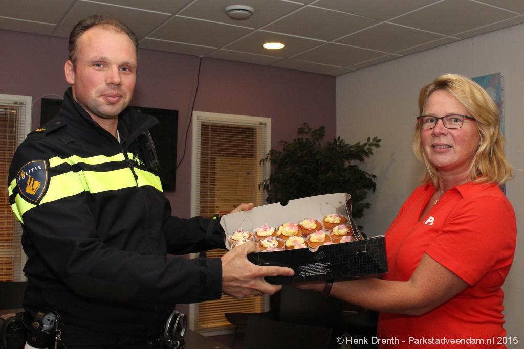ONDERSTEUNING - Vanmorgen hebben SP- medewerkers aan personeel van ambulancedienst en de politie in Veendam op zelfgebakken cupcakes getrakteerd. De meer dan 100 cupcakes waren meegebracht uit de SP- afdelingen van Menterwolde, Veendam, Hoogezand-Sappemeer en Pekela. Dit was niet omdat er reden voor een feestje is. Maar om met deze actie het politiepersoneel en van de ambulancedienst een hart onder de riem te steken.