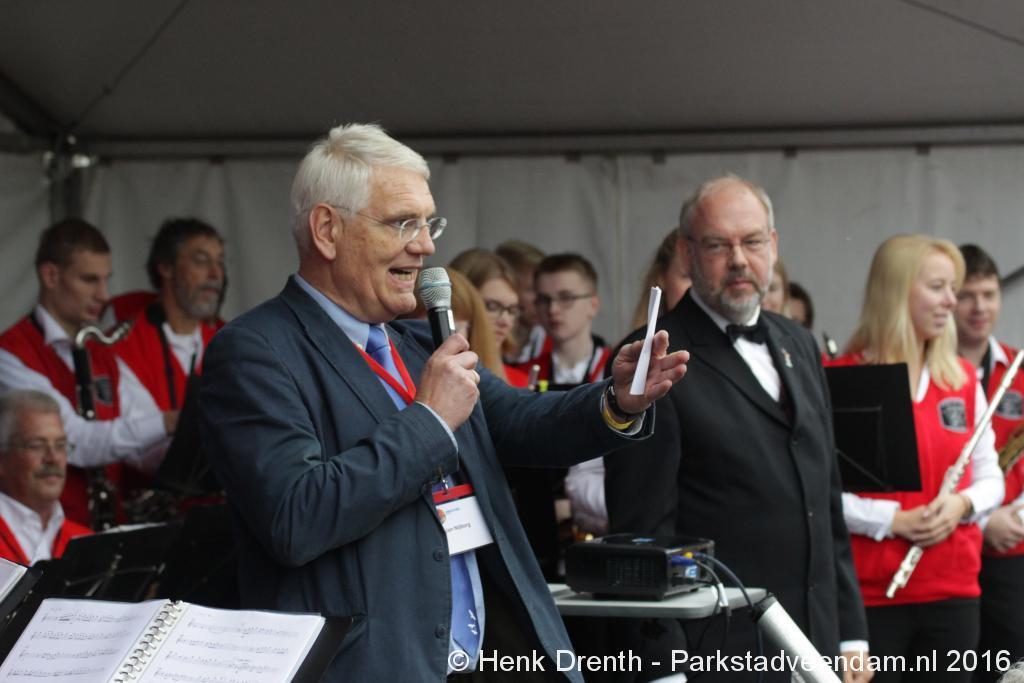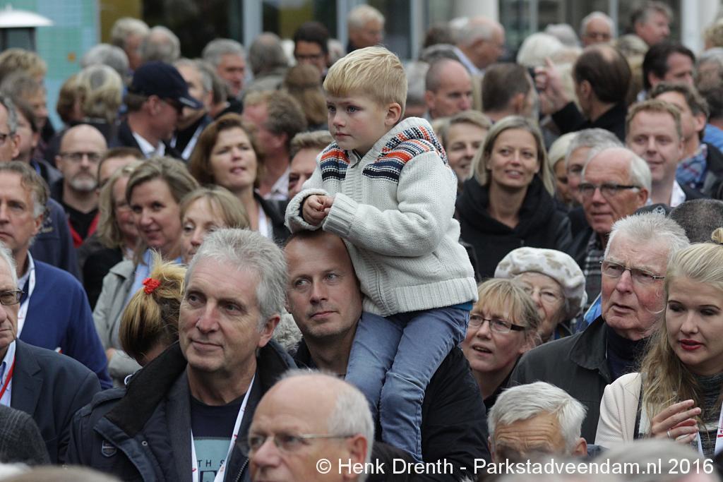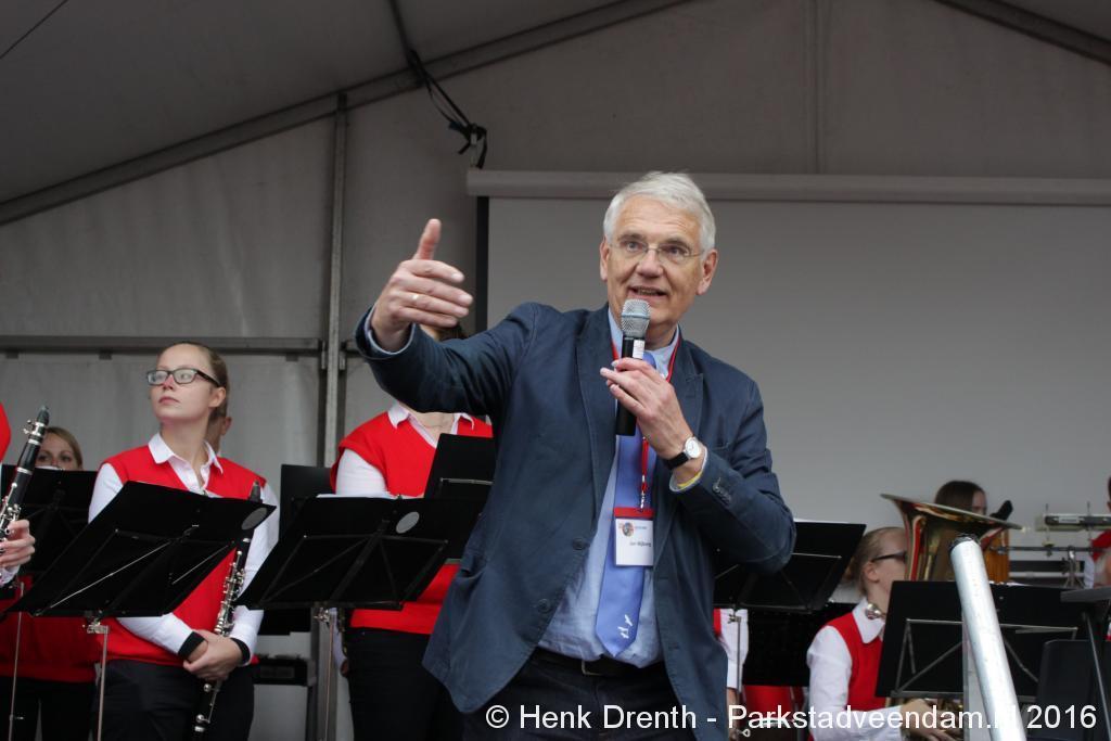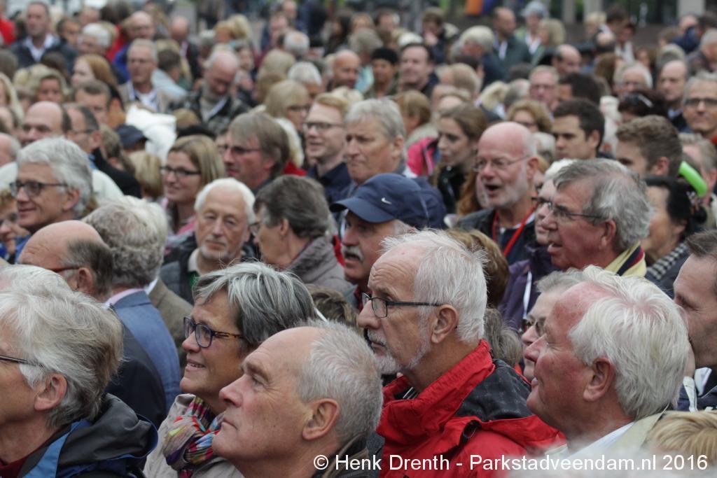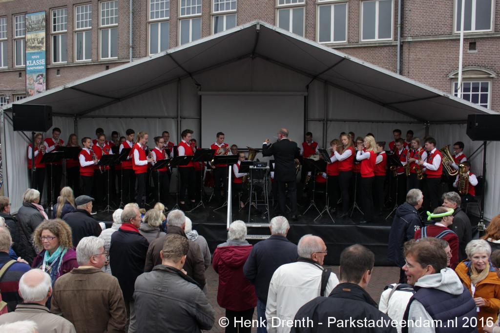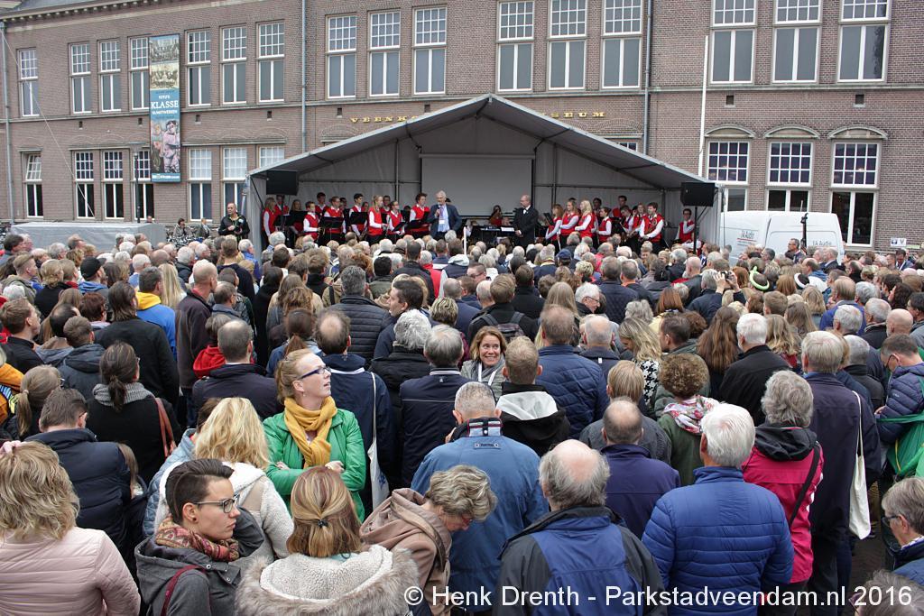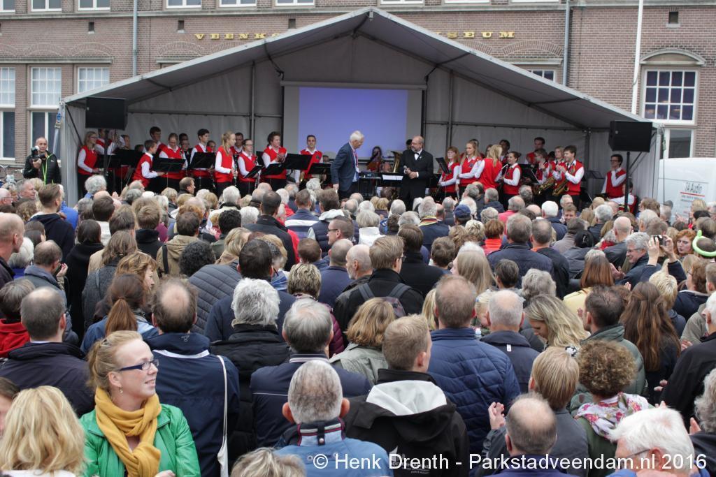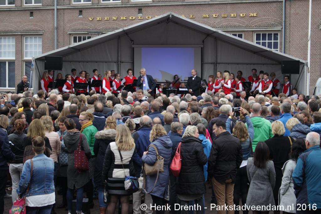 Op het Museumplein vond het gezamenlijk programma plaats. Het plein stond grotendeels vol met reünisten, en om die allemaal op het groepsportret te krijgen had fotograaf Buiring stelling genomen op het balkon van een flat. Om 16 uur speelde de Winkler Prins Harmonie het speciaal door Andreas Ludwig Schulte gecomponeerd muziekstuk 'Overture to a Jubilee', dat het symbool voor het logo van de Winkler Prins volgt. Waarin de metafoor van de drie vogels voor het steeds meer volwassen worden, uitgroeiend naar volwassenheid en het uit gaan vliegen. De compositie begint ook wat gemankeerd, symbool staand voor het beginnen met leren. En het onder begeleiding steeds vaardiger worden op weg naar zelfstandigheid. Dat is ook de metafoor die in de muziek zit.