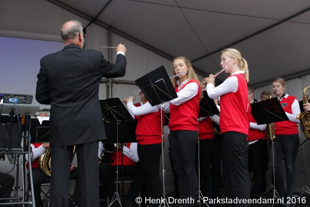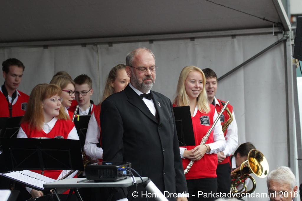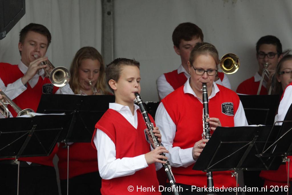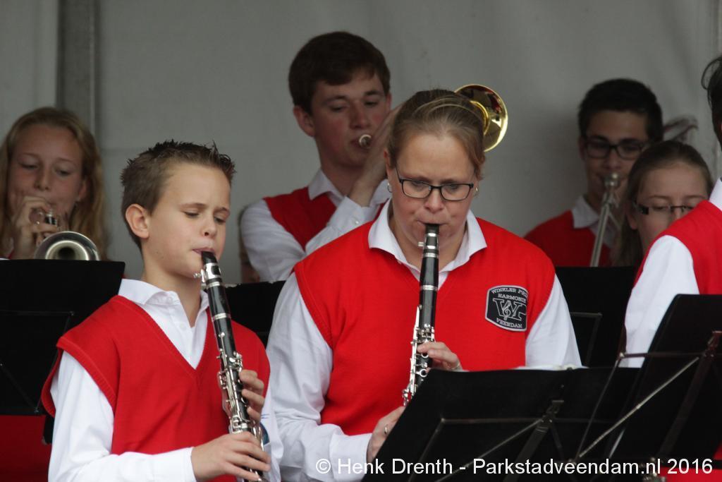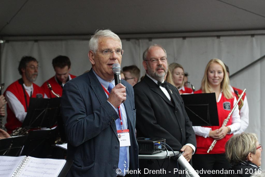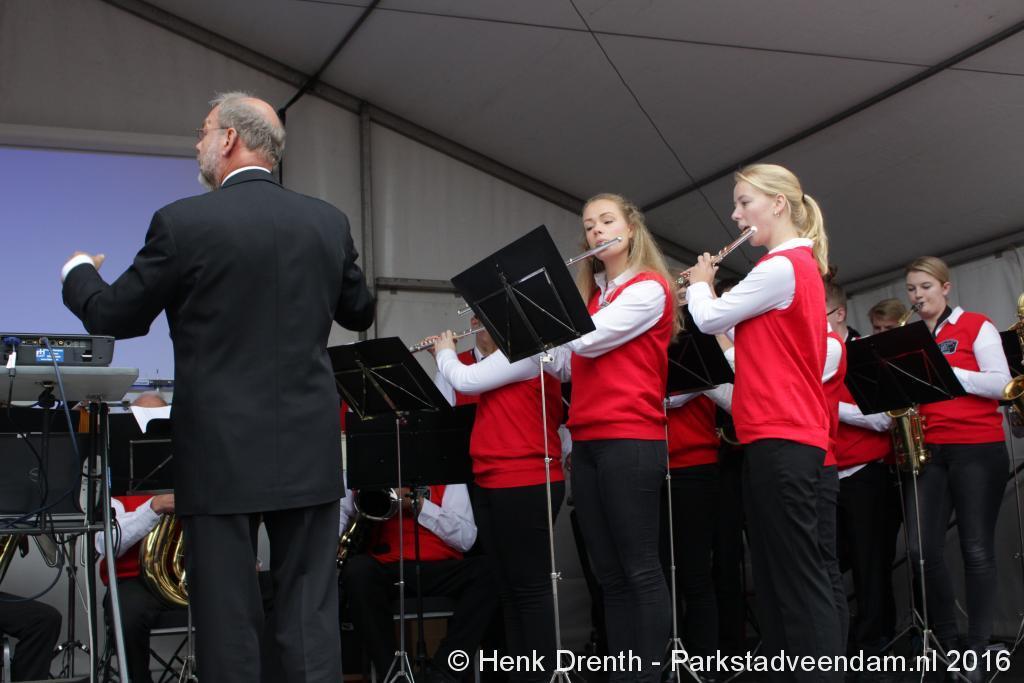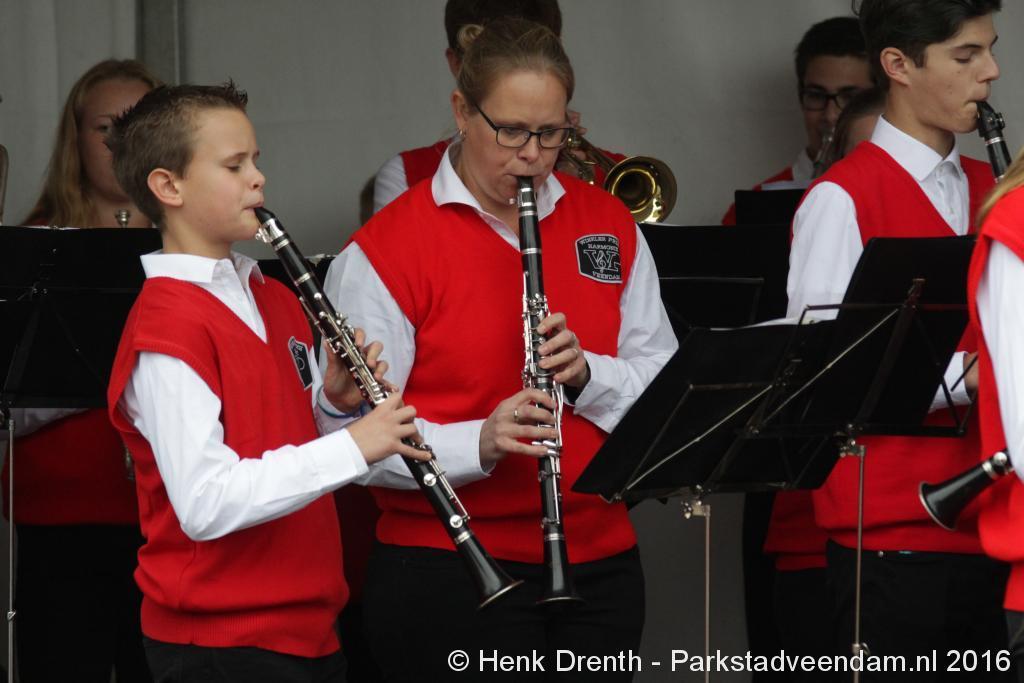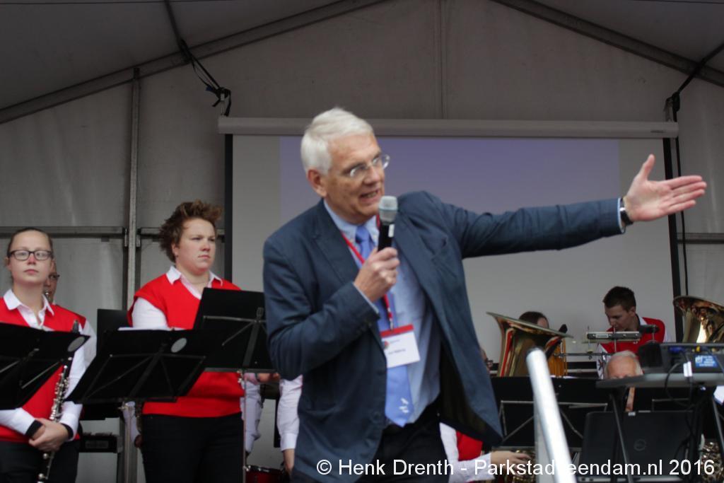 Op het Museumplein vond het gezamenlijk programma plaats. Het plein stond grotendeels vol met reünisten, en om die allemaal op het groepsportret te krijgen had fotograaf Buiring stelling genomen op het balkon van een flat. Om 16 uur speelde de Winkler Prins Harmonie het speciaal door Andreas Ludwig Schulte gecomponeerd muziekstuk 'Overture to a Jubilee', dat het symbool voor het logo van de Winkler Prins volgt. Waarin de metafoor van de drie vogels voor het steeds meer volwassen worden, uitgroeiend naar volwassenheid en het uit gaan vliegen. De compositie begint ook wat gemankeerd, symbool staand voor het beginnen met leren. En het onder begeleiding steeds vaardiger worden op weg naar zelfstandigheid. Dat is ook de metafoor die in de muziek zit.