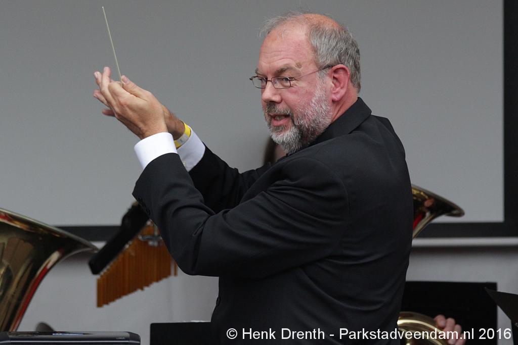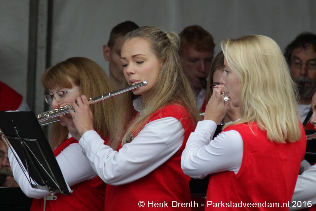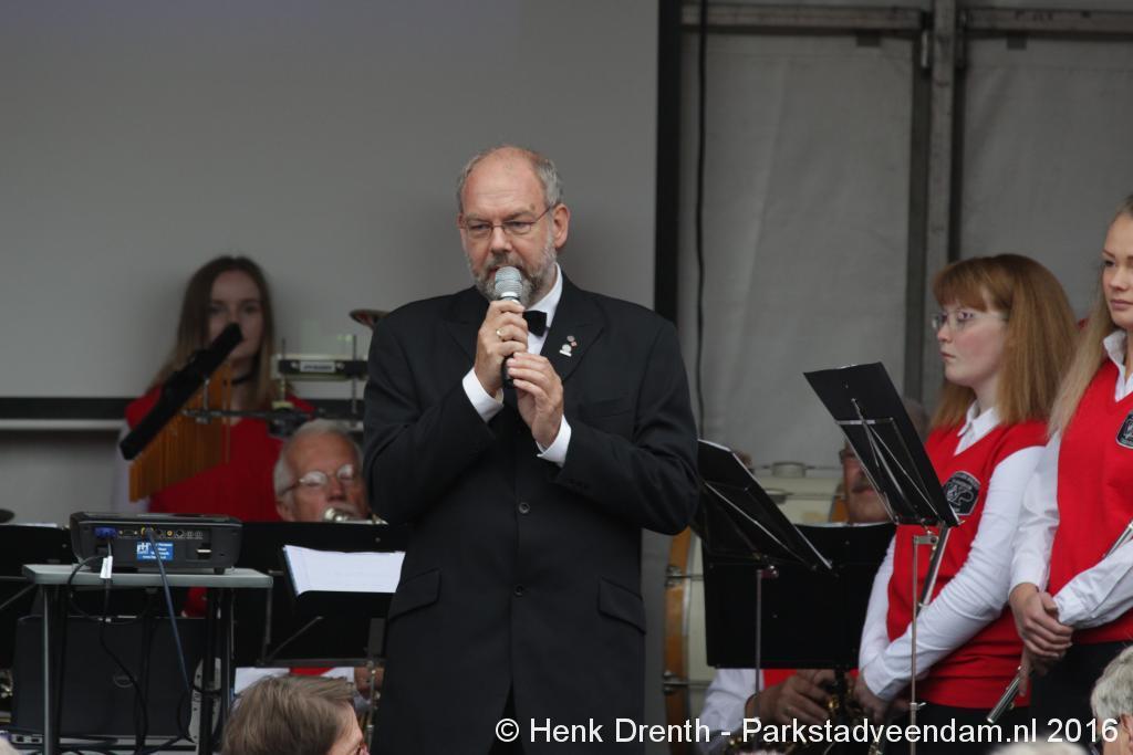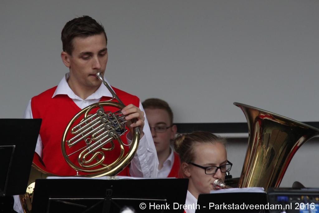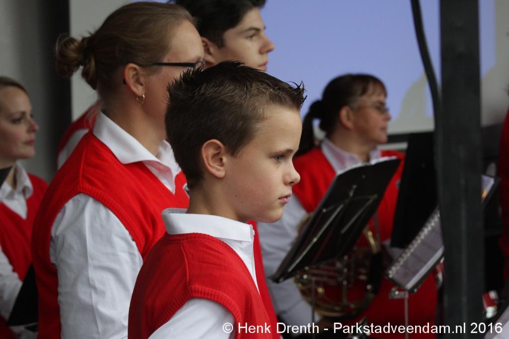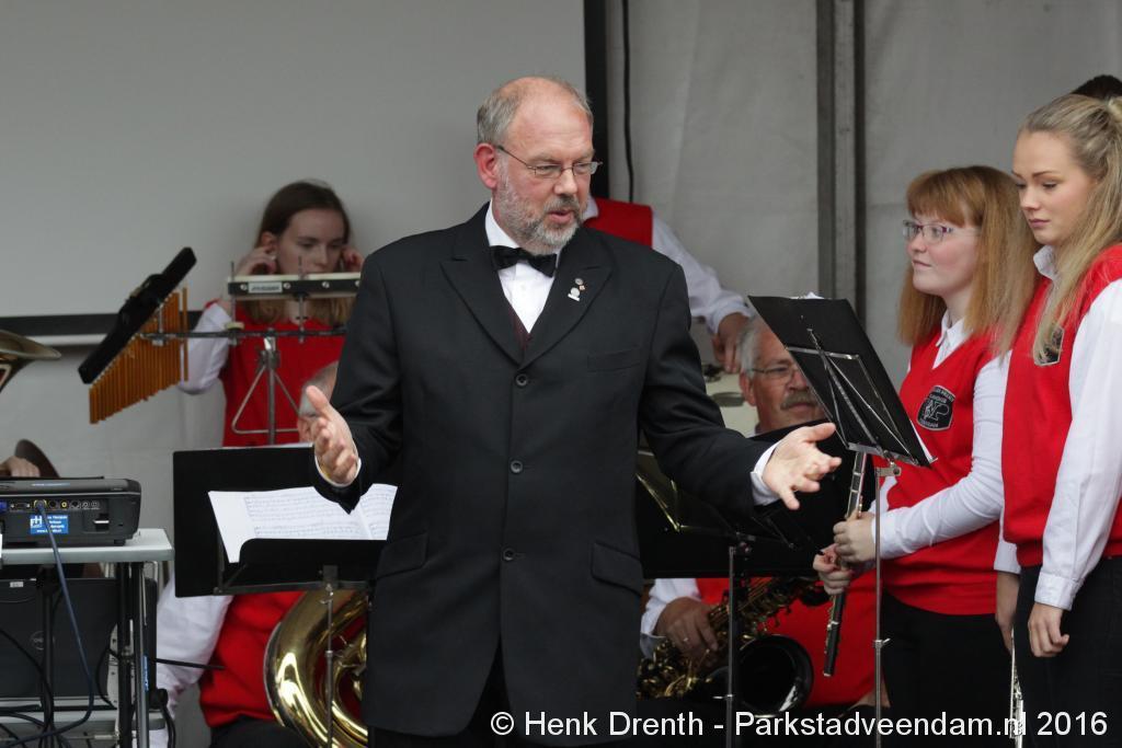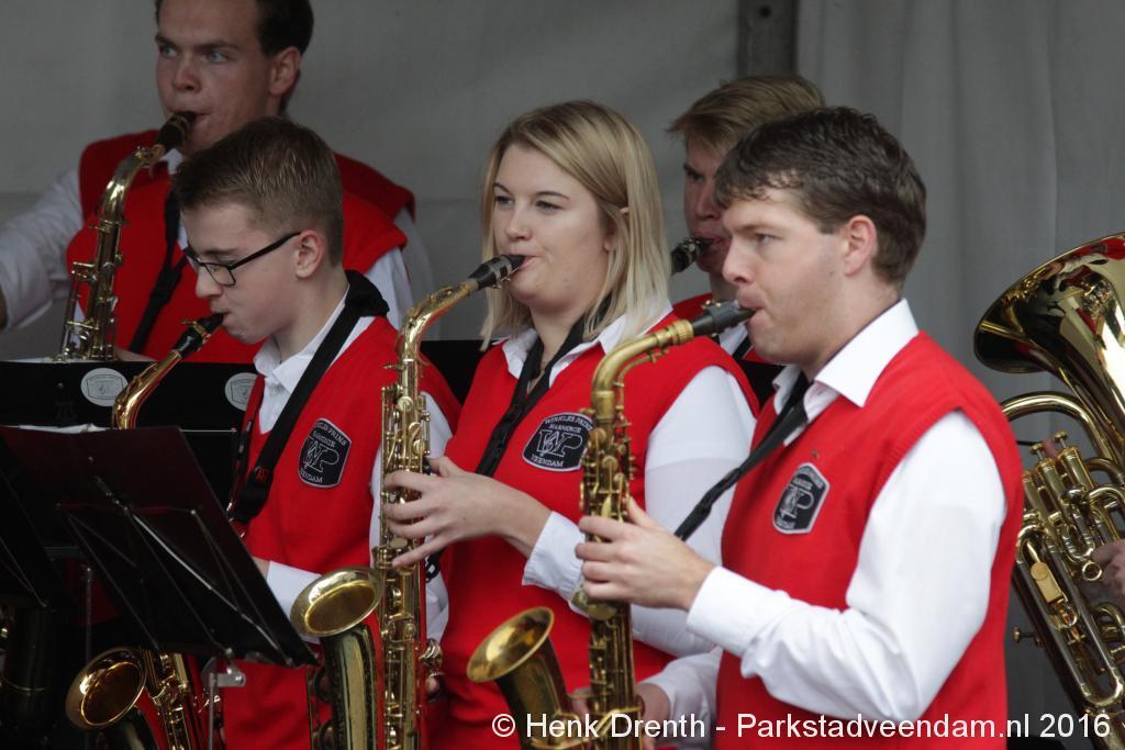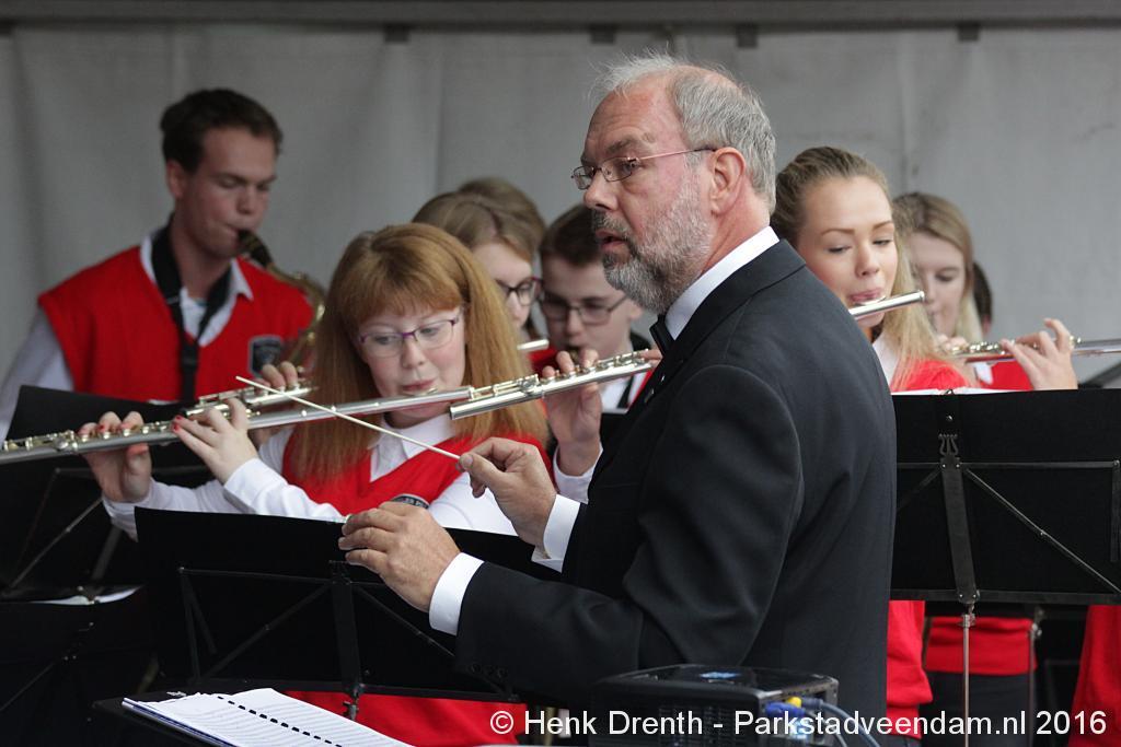 Op het Museumplein vond het gezamenlijk programma plaats. Het plein stond grotendeels vol met reünisten, en om die allemaal op het groepsportret te krijgen had fotograaf Buiring stelling genomen op het balkon van een flat. Om 16 uur speelde de Winkler Prins Harmonie het speciaal door Andreas Ludwig Schulte gecomponeerd muziekstuk 'Overture to a Jubilee', dat het symbool voor het logo van de Winkler Prins volgt. Waarin de metafoor van de drie vogels voor het steeds meer volwassen worden, uitgroeiend naar volwassenheid en het uit gaan vliegen. De compositie begint ook wat gemankeerd, symbool staand voor het beginnen met leren. En het onder begeleiding steeds vaardiger worden op weg naar zelfstandigheid. Dat is ook de metafoor die in de muziek zit.