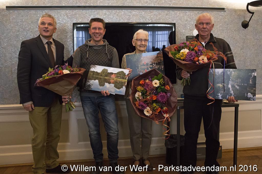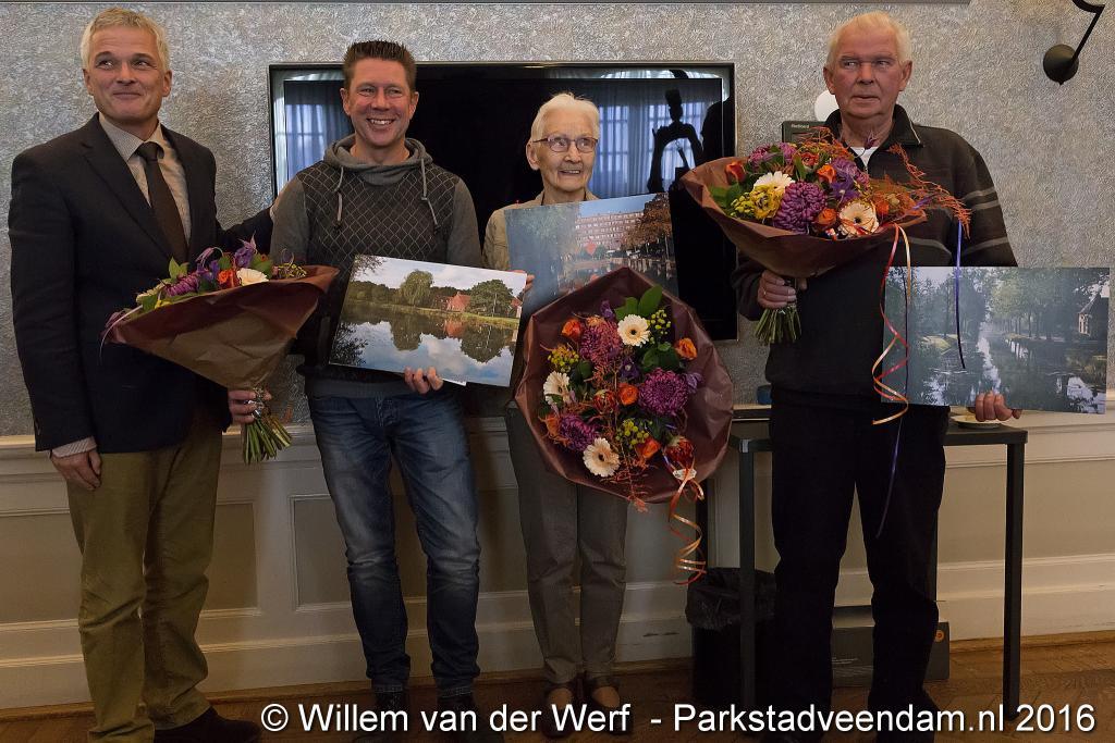 Jurry Veendammer van het Jaar Jan Starke, vakfotograaf Bert Buiring. en Wethouder Jaap Velema