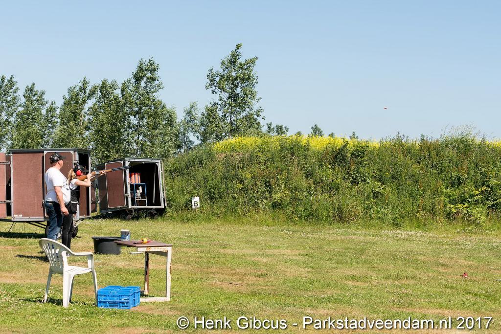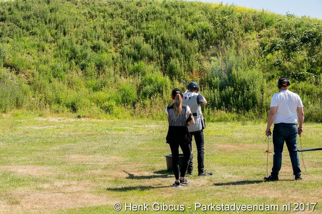 Ja, kleiduiven, wat zijn dat nou? Kleiduiven, ook wel eco duiven genaamd, zijn als het ware een soort schoteltjes van geperst zand + bindmiddel. Ze zijn aan één zijde oranje gekleurd en bestaan uit verschillende maten en vormen. De kleintjes zijn wat sneller dan de grotere, die een Ø ca. 11 cm hebben. Rabbits (konijntjes/haasjes), wat boller van vorm, rollen gemakkelijker over de grond en zijn dan doelwit van de schutter - vandaar de naam. Er wordt op kleiduiven en rabbits geschoten met een hagelgeweer. Het geweer bevat 2 patronen. Deze munitie is een hagelpatroon, deze bestaat uit een huls, een slaghoedje met onderin het kruit, een bekertje met de hagel (stalen kogeltjes). Bij de trainingen – afstanden van 30 tot 40 m worden patronen gebruikt met 24 of 28 gram hagel. Bij de échte jacht wordt zwaarder munitie gebruikt, maar is de afstand ook vaak groter! De kleiduif schiet dus door de lucht en de schutter moet hem zien te raken, zo simpel is het. Schiet de schutter raak, dan spat de kleiduif in duizenden stukjes uiteen. Maar… vergis je niet.