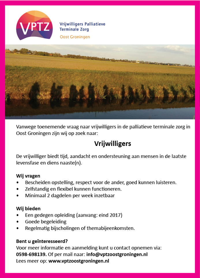 Vrijwilligers Vrijwilligers gezocht voor de palliatieve terminale zorg Door Admin op donderdag, 28 september, 2017 - 21:14