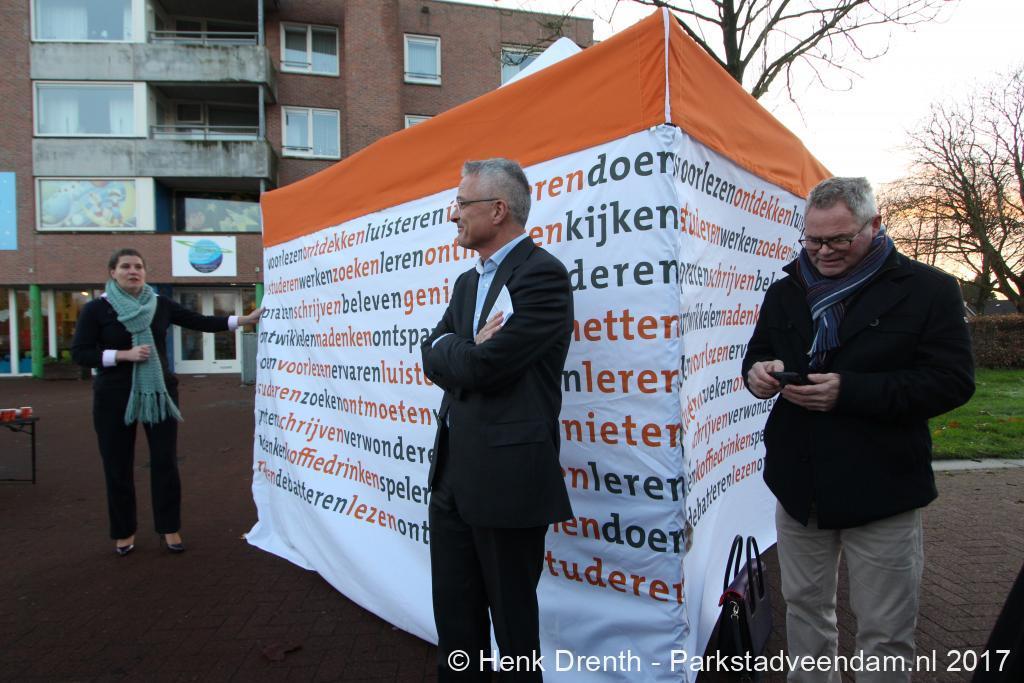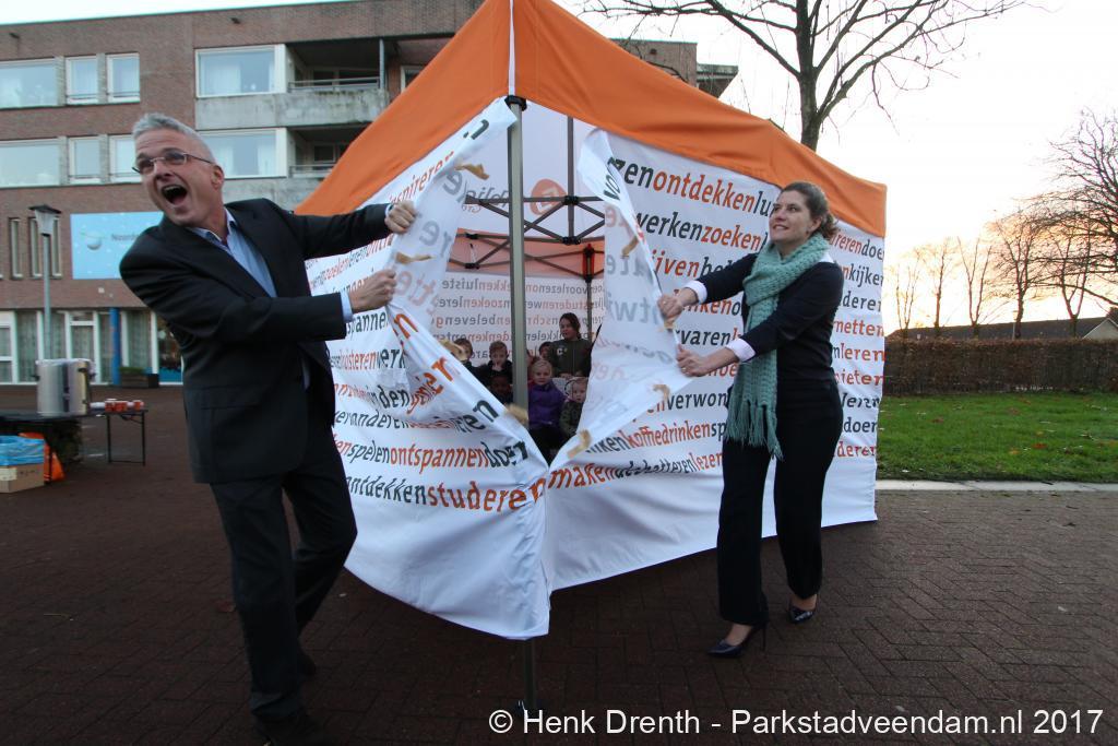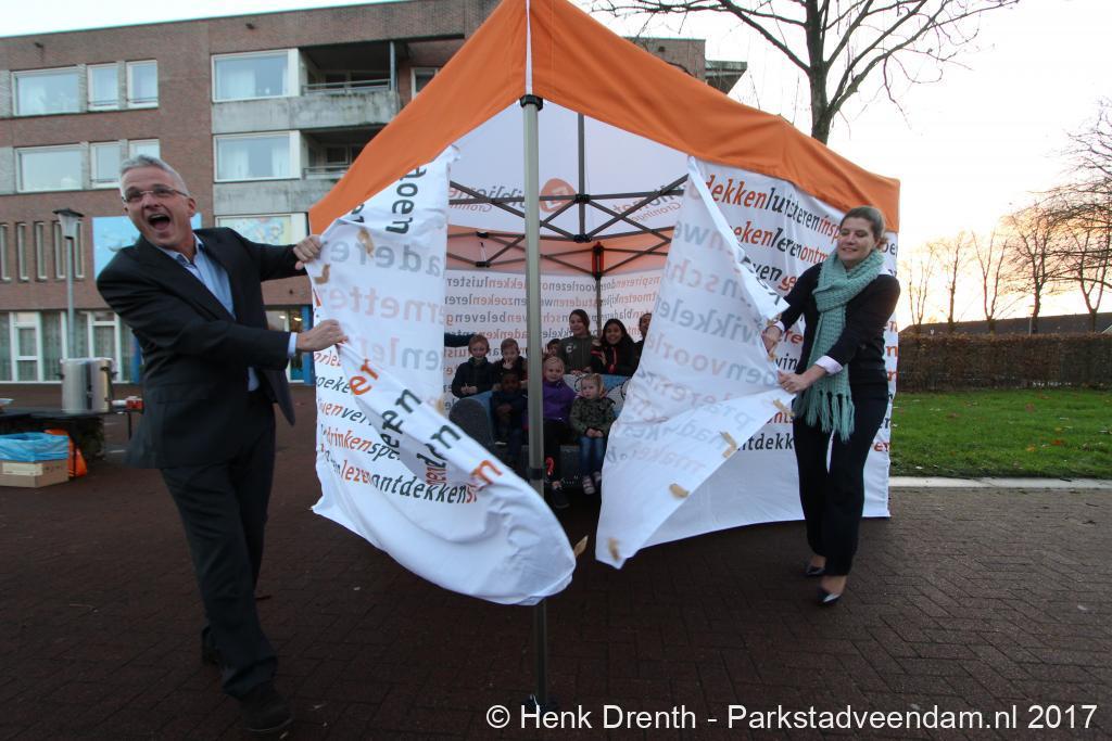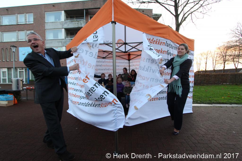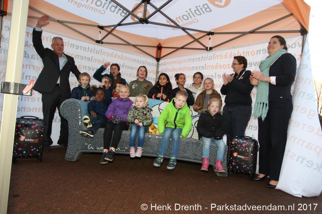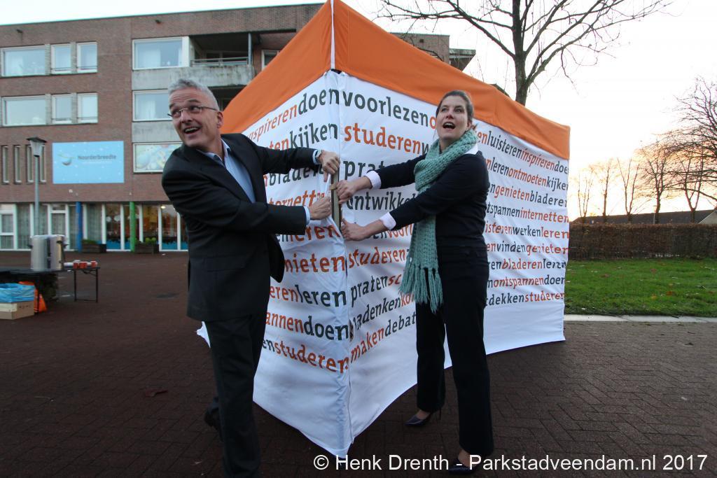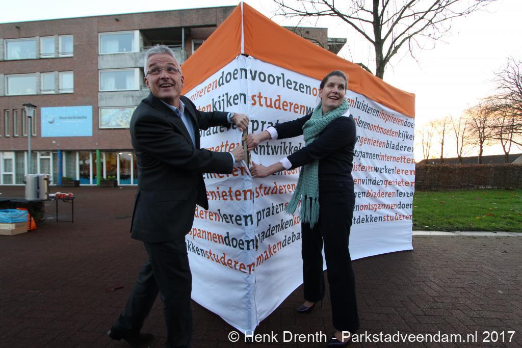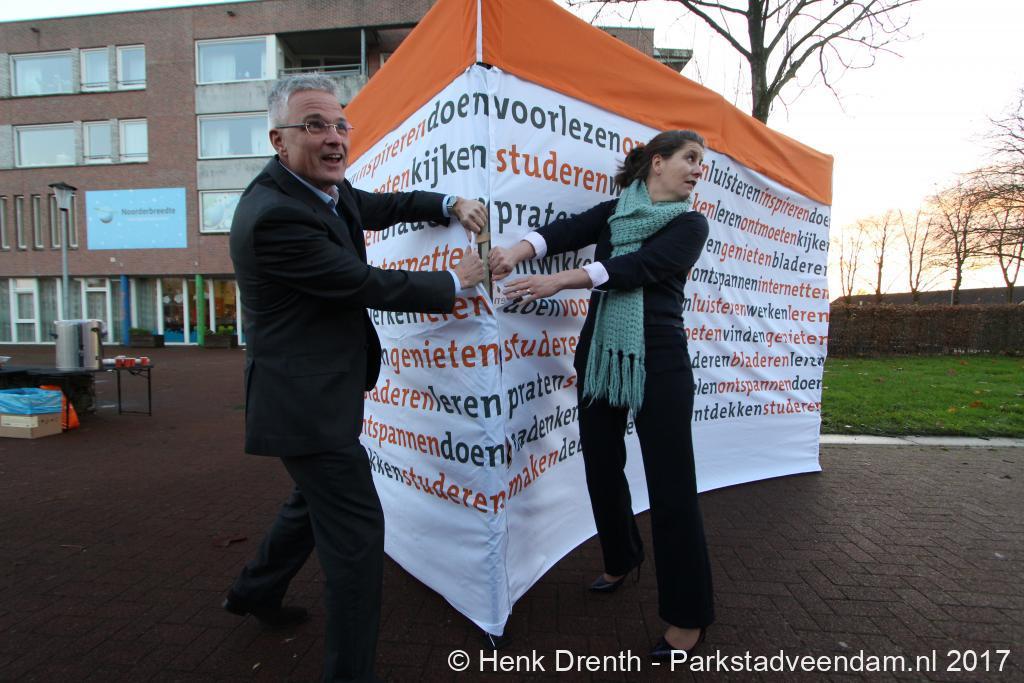 De gedeputeerde en de wethouder trokken elk aan een kant de VakantieVoorleestent open, waarin niet alleen een mooi Social Sofa te voorschijn kwam, maar ook met leerlingen van De Noorderbreedte erop zittend. Ze hadden zich tot aan de onthulling muisstil gehouden.
