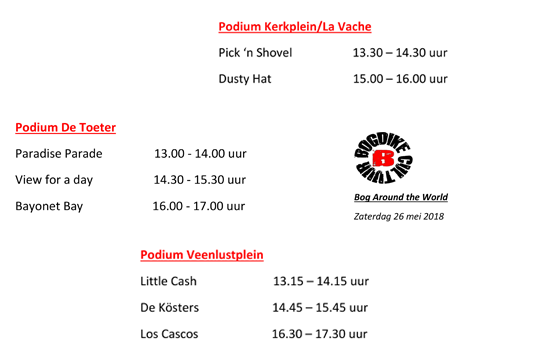 Op zaterdag 26 mei organiseert stichting Bogdike haar eerste muziekevenement in het Veendammer centrum. Op het Kerkplein, het Veenlustplein en het Beneden Westerdiep treden tussen 13.00 en 18.00 uur 8 bands op. Bogdike heeft geprobeerd om diverse muziekstijlen samen te brengen voor een muzikale wereldreis. Van bluegrass, rock, country en latin maar blijven we ook dicht bij huis met onze eigen moerstaal. En zo komt alles tezamen tijdens de eerste editie van Bog around the World. In verband met de finish van de rally Veendam – Leer – Veendam vervalt het podium op het Museumplein. Maar met wat over en weer schuiven is het Bogdike gelukt om alle bands toch voldoende speeltijd te geven op 3 locaties.