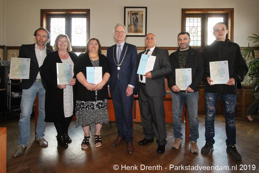 De van origine Engelse Sonja Ann Barron heeft met haar man er al heel lang over gehad om vanwege de kinderen de Nederlandse nationaliteit aan te nemen. Haar man was haar in maart al voorgegaan. De van origine Turkse Hassan Yurtbay kreeg na het verlenen van het Nederlanderschap eveneens de bijbehorende ingelijste bekendmaking. Mark Lüpkes heeft een Duitse moeder en een Nederlandse vader. Hij is een geboren en getogen Veendammer. Burgemeester Sipke Swierstra voegde na de verklaring van verbondenheid bij het Veendammer zijn hem ook het Nederlanderschap toe. Rejhan Hasić is ook geboren (Rotterdam) en getogen in Nederland.