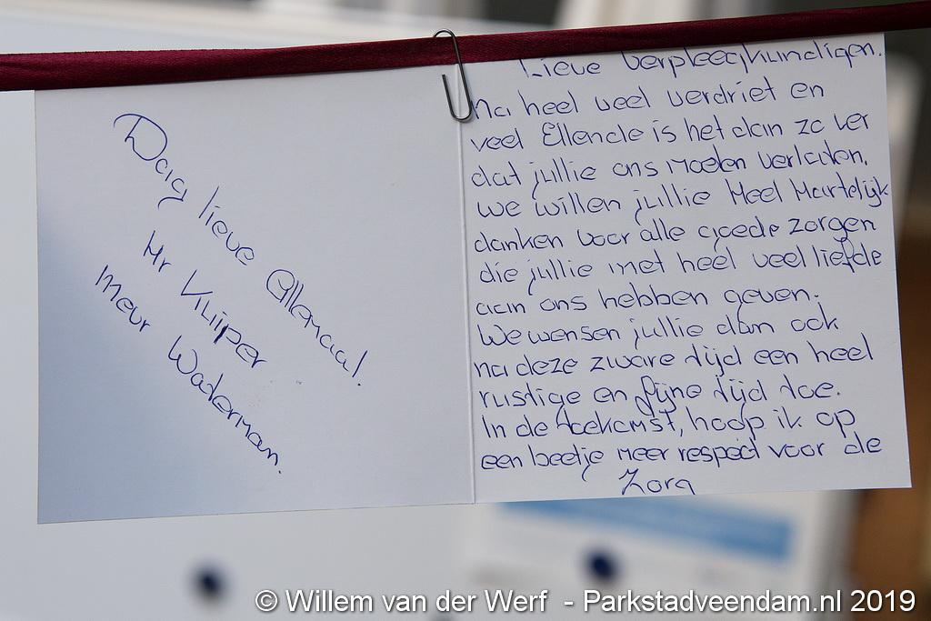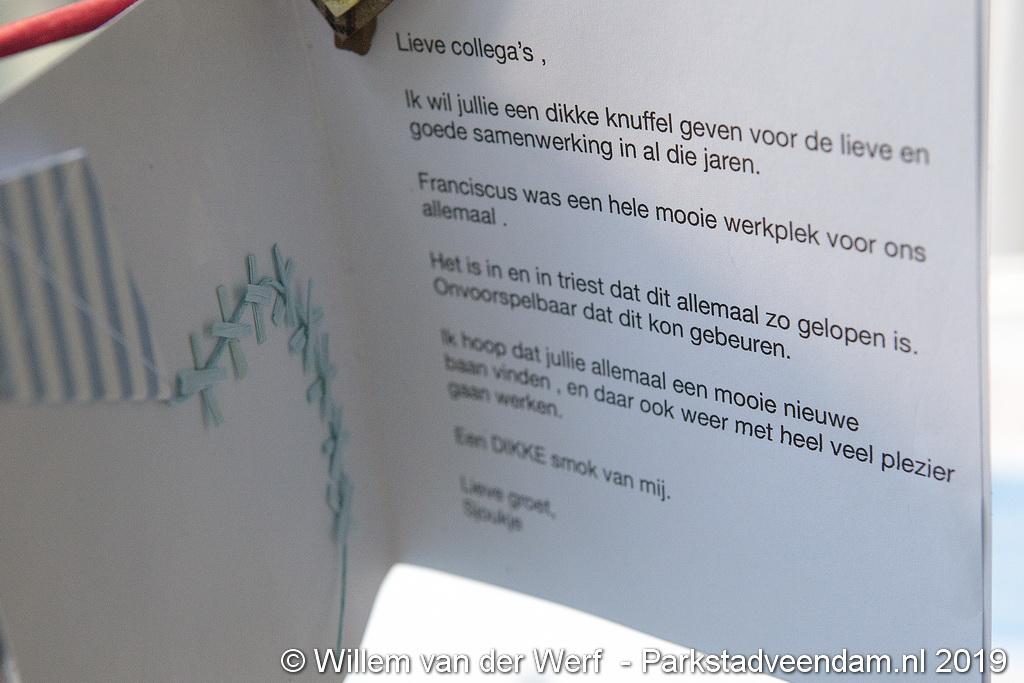 Mevrouw Venema, bewoner van Huize St. Franciscus, sprak de medewerkers toe met tranen in haar ogen. “Ik ga dinsdag verhuizen omdat het moet, maar ik wil helemaal niet”. De medewerkers en bewoners hoorden haar verhaal met veel verdriet aan.