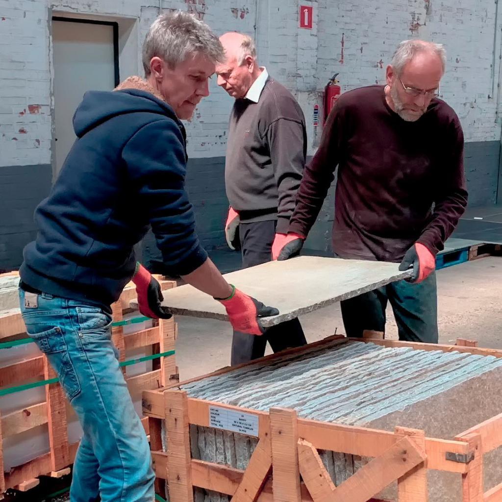 Aan C.W. Lubbersstraat hebben ze een enorme expertise op het gebied van natuursteen. We lopen samen met Hanneke en Roelof Jacob de Weijs over het terrein. Dit is Frans marmer en daarnaast hardsteen uit de Ardèche. Hanneke: “Hier flagstones, die kun je uitstekend gebruiken voor in de tuin en deze blauwe arduintegels staan schitterend als vloertegels in een modern huis. Ze worden vaak aanbevolen door binnenhuisarchitecten! Als wandbekleding kun je deze steenstrips aanbrengen. Ze hebben een prachtige bronzen kleur en veel reliëf.” Verderop ligt Chinees leisteen en daar kwartsiet uit India wijst Roelof Jacob. Tussendoor legt hij uit dat kwartsiet bestaat uit samengeperst zand, mineralen en kwarts. Het is extreem hard. Binnen op kantoor laat hij het zien in het licht. De glinstering/schittering zit door de hele steen heen. Heel bijzonder. Deze steensoort komt uit onze eigen groeve in Zambia! Hardsteen vervolgt hij is een verharde kalksteen, die bestaat uit verschillende kalklagen en zeediertjes. Deze zijn in miljoenen jaren tot hardsteen gevormd. Basalt is een stollingsgesteente van het vulkanische lava. Op een aangename manier worden we wegweijs gemaakt in natuursteenland.
