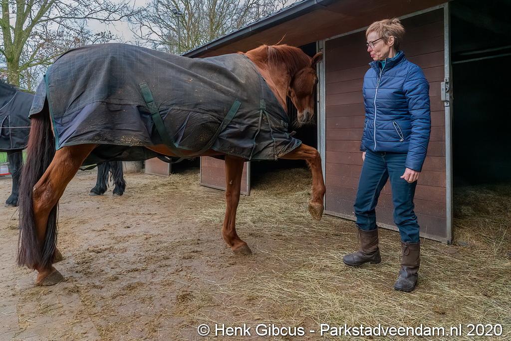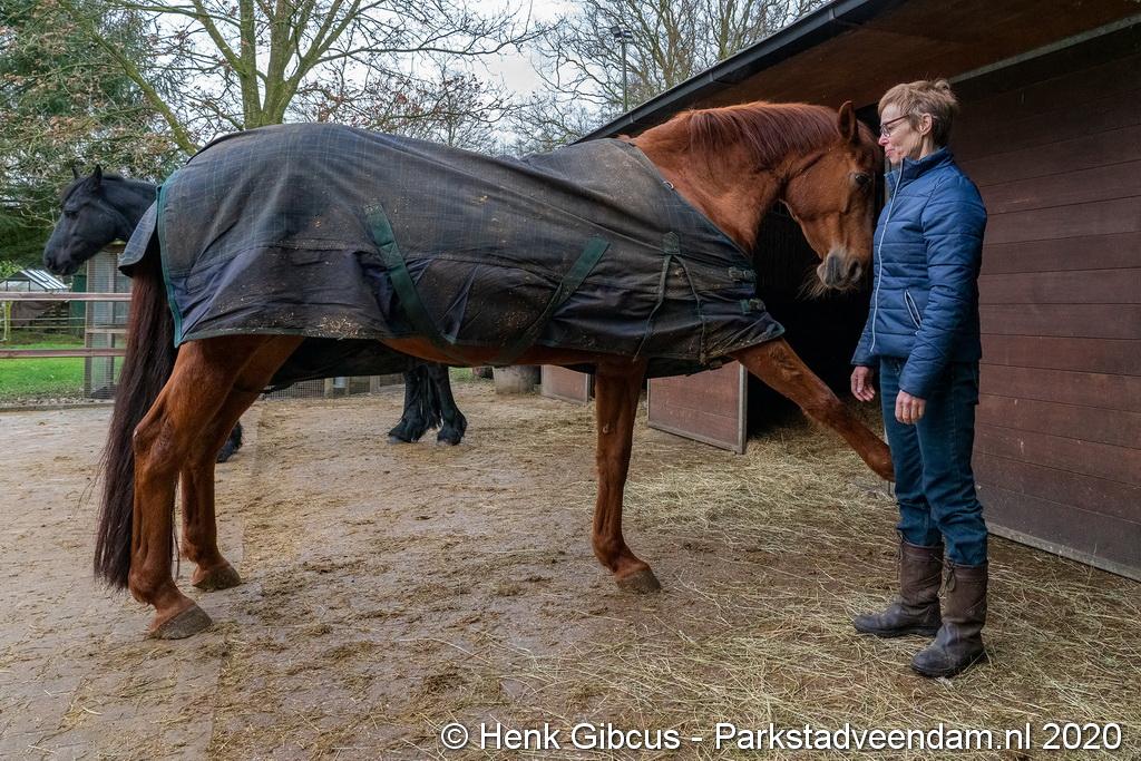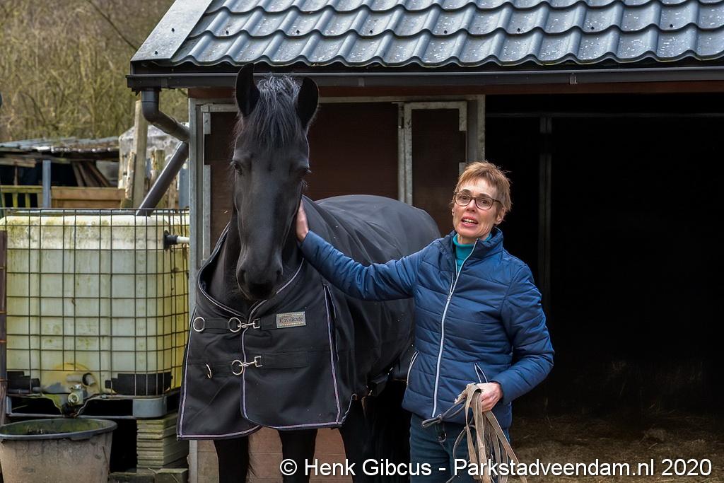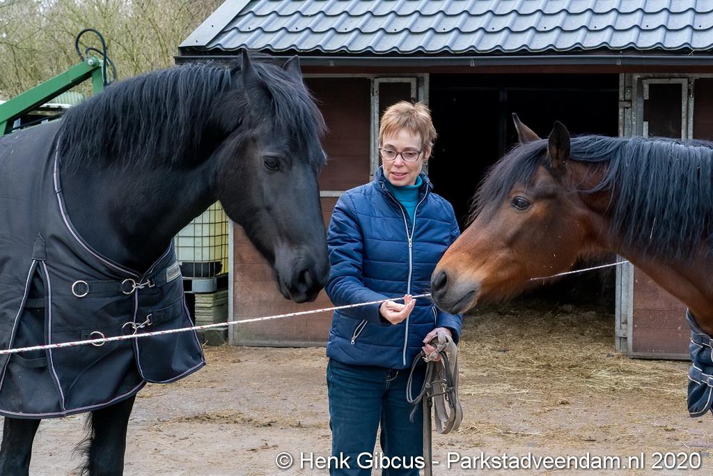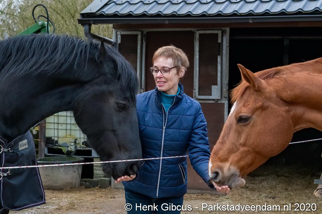 Bij aankomst voor het interview staan haar paarden lekker te smikkelen van het hooi wat ze net gekregen hebben. Haar paarden zijn: Duke een pony van 21 jaar, Impression, een vos van 20 jaar en Lotte een Fries van 8 jaar. Het hooi trekt meer dan de onbekende persoon die op bezoek komt.