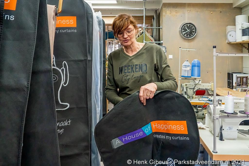 “Een klant komt naar de winkel voor gordijnen of raambekleding. Vaak neemt deze een foto mee van het huis/interieur. Samen kijken we wat de klant aanspreekt en of het past in de sfeer en stijl van de woning. Met de stalen stof gaan we naar de klant om te kijken of het ook ter plekke aan de eisen voldoet. Eventueel geef ik nog aanvullende kleur- of stijladviezen. Bij akkoord meet ik persoonlijk alles op en maak een offerte. Is die OK, dan bestellen we het geoffreerde en maken we de raambekleding op maat in ons eigen atelier (achter in de winkel). Verschillende machines hebben we hiervoor nodig: een stikmachine (gewone naaimachine), een zomenmaker, een plooier om de haken in de gordijnen te maken en een lokker. Deze laatste snijdt de stof en werkt die af. Verder is er een kniptafel, een strijktafel.” Anneke werkt al sinds 24 jaar bij Regina. Het is haar rechterhand. Zij bedient met grote deskundigheid de “naaimachines” en zorgt ervoor dat de raambekleding zo wordt gemaakt als is besteld. Indien nodig springt ze bij in de winkel. “De gerede gordijnen hangen we in daarvoor bestemde hoezen. Tenslotte hangt onze stoffeerder de raambekleding bij de klant thuis netjes op,” legt Regina uit. “We regelen alles van A tot Z.”