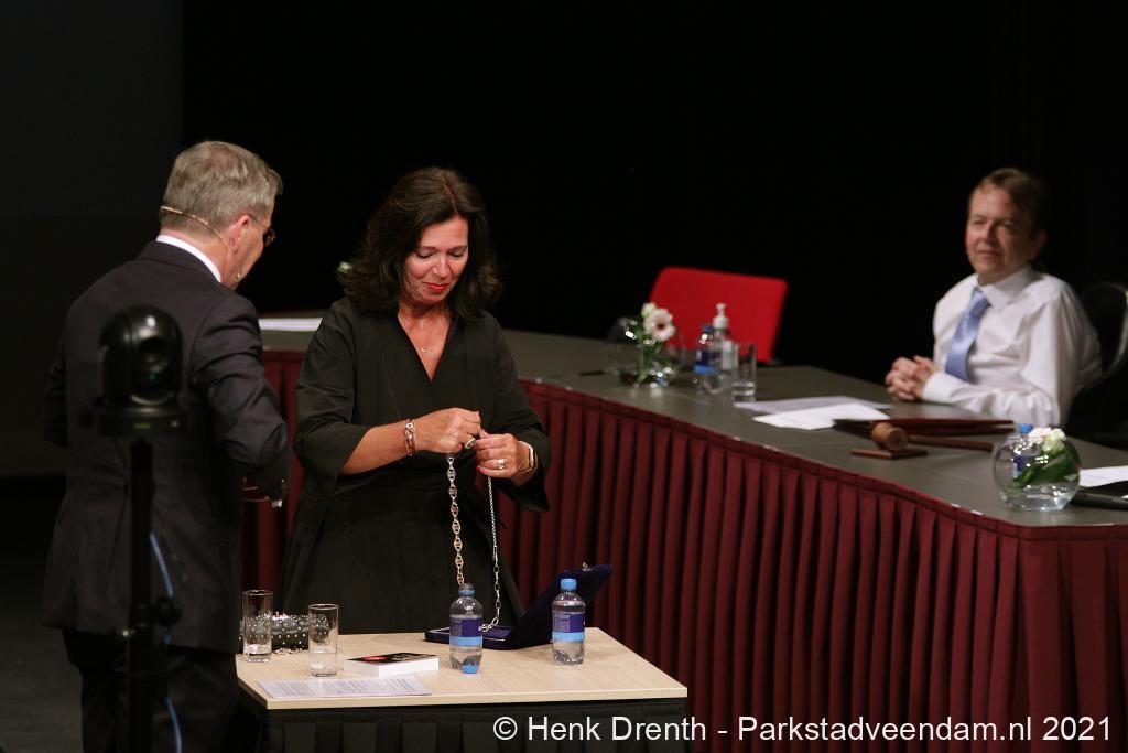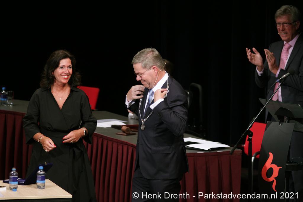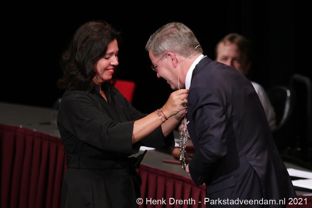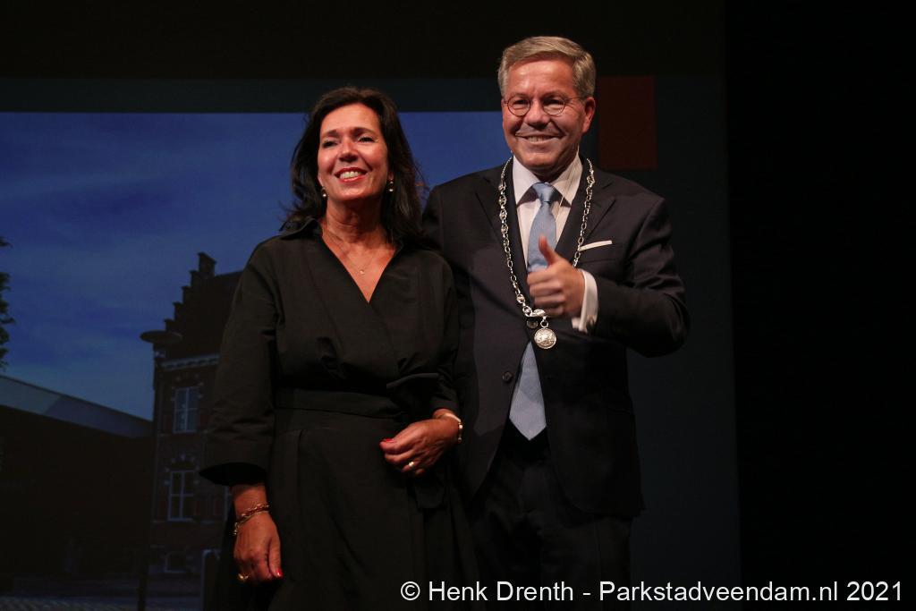 Voor Berry Link zijn vriendin Caroline Reijnaerts was er de bijzondere taak om hem zijn ambtsketen om te doen. Op de woensdagavond hebben inwoners van Veendam kennis gemaakt met de nieuwe burgemeester.