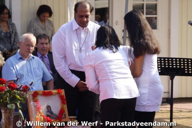 Er werd ook nog een gebed voor gelezen in het Hindoestaans en daarna vertaalt in het Nederlands. Vervolgens 1 minuut stilte. Na deze plechtigheid ging de familie Mohansingh, zoals ieder jaar op 23 september, naar Zoutkamp. Daar werd Varscha’s as, naar traditioneel Hindoeïstisch gebruik boven stromend water verstrooid. In Zoutkamp worden bloemen op het water gegooid en een lichtje aangestoken.