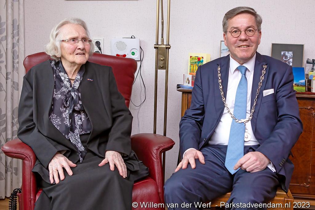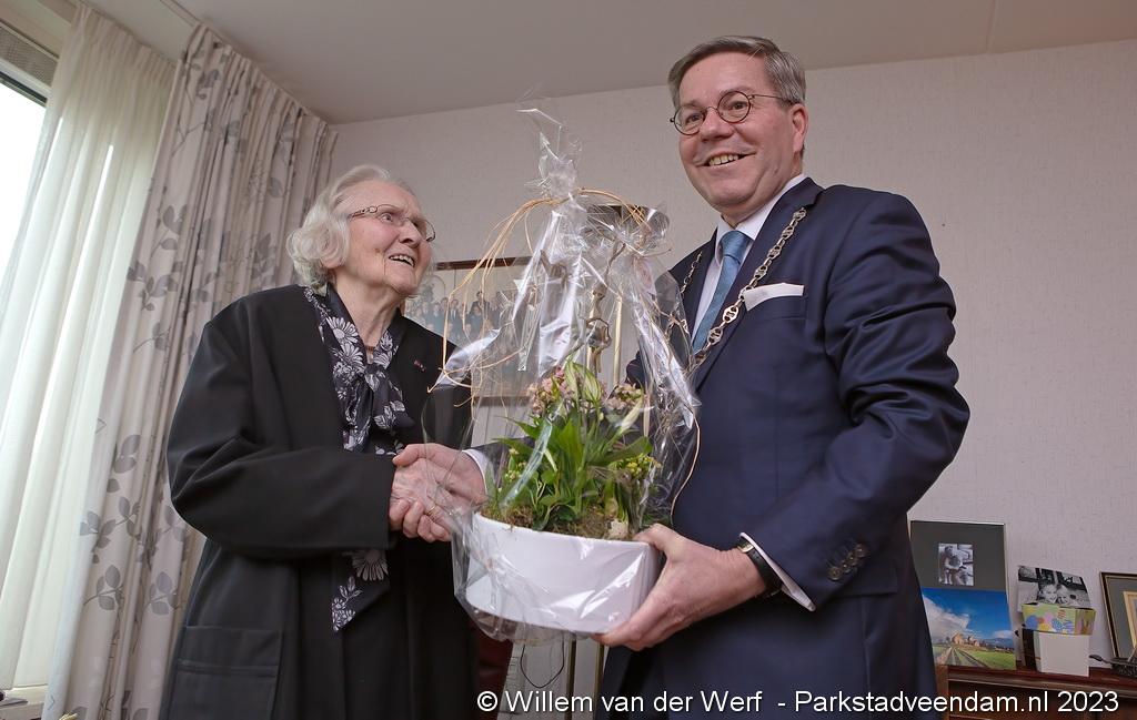 Mevrouw J.Pot-Oudekerk vierde zondag haar 100 ste verjaardag. Burgemeester Berry Link van de gemeente Veendam feliciteerde haar maandagmiddag persoonlijk bij haar thuis aan de Kieler Bocht in Veendam.